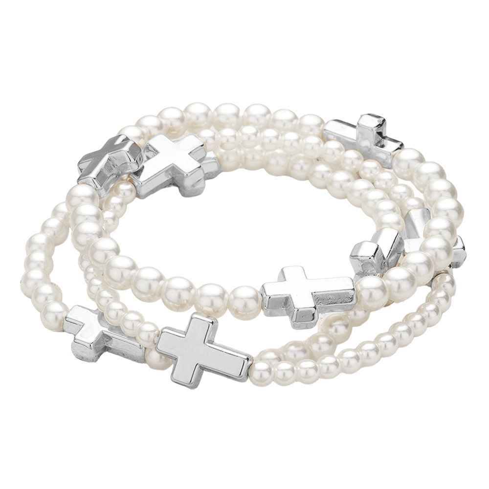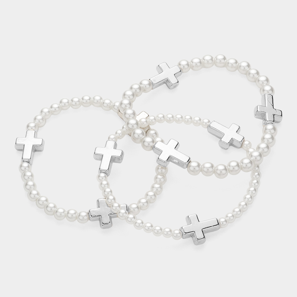 3PCS - Metal Cross Pointed Pearl Beaded Stretch Multi Layered Bracelets