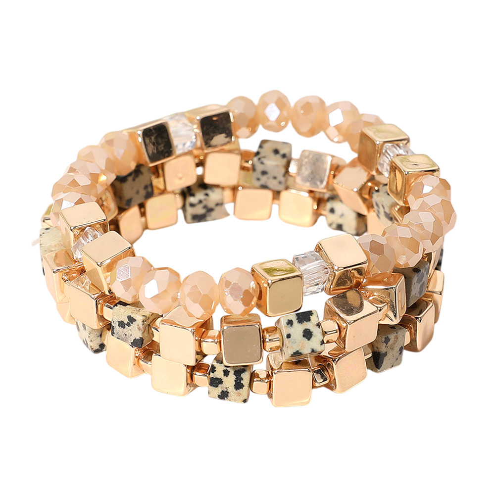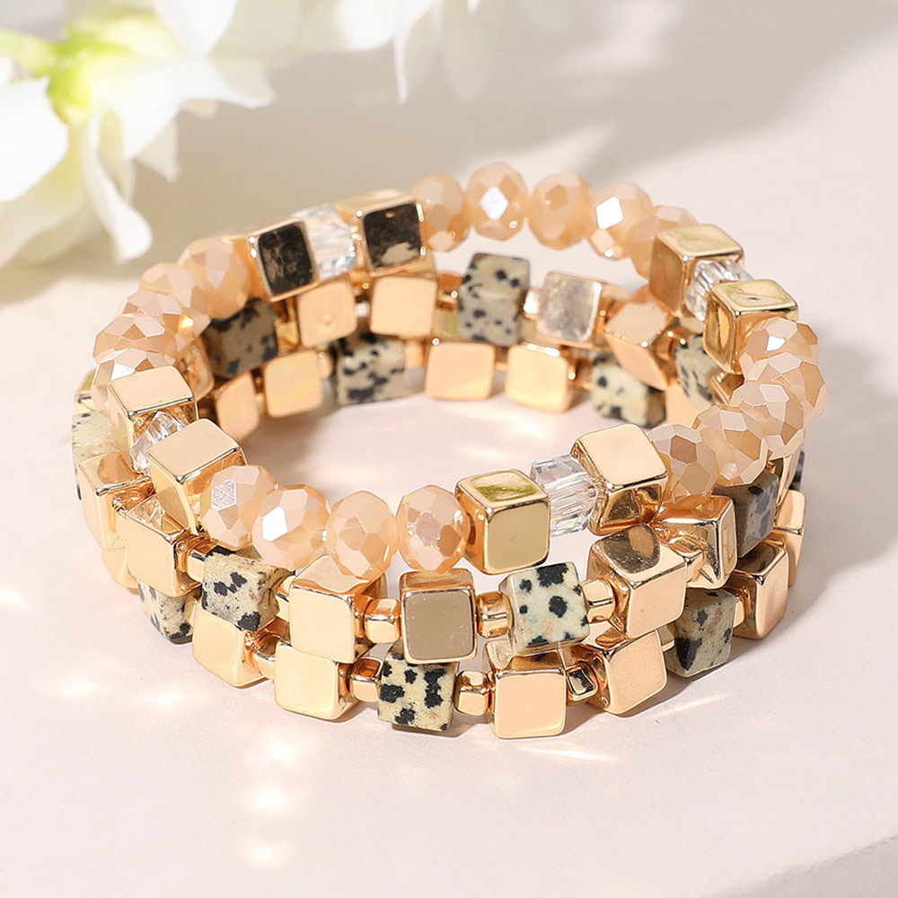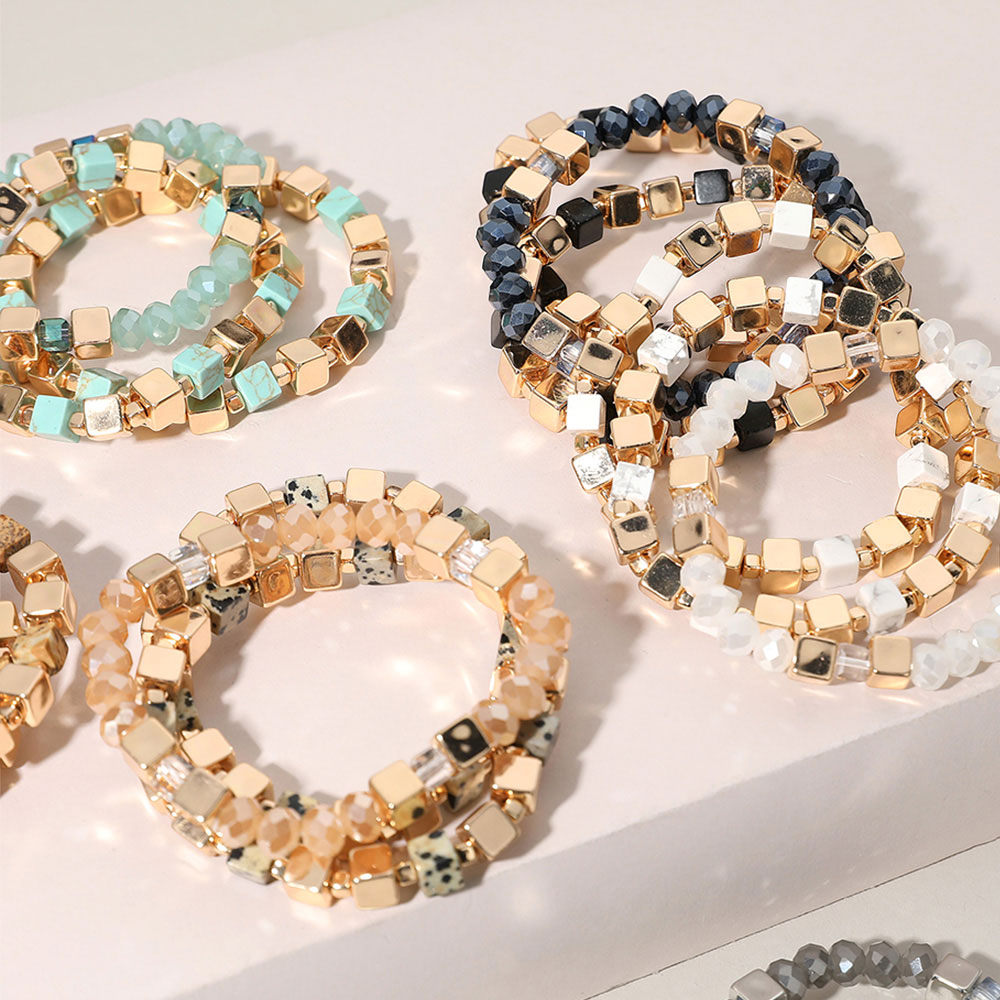 Details • Size : 1.2" H • Stretchable • Chic stackable bracelet set featuring a mix of stone beads, faceted accents, and square details. Designed with a stretch fit for easy wear and stylish layering. A trendy accessory for everyday outfits or gifting. • Lead and Nickel Compliant