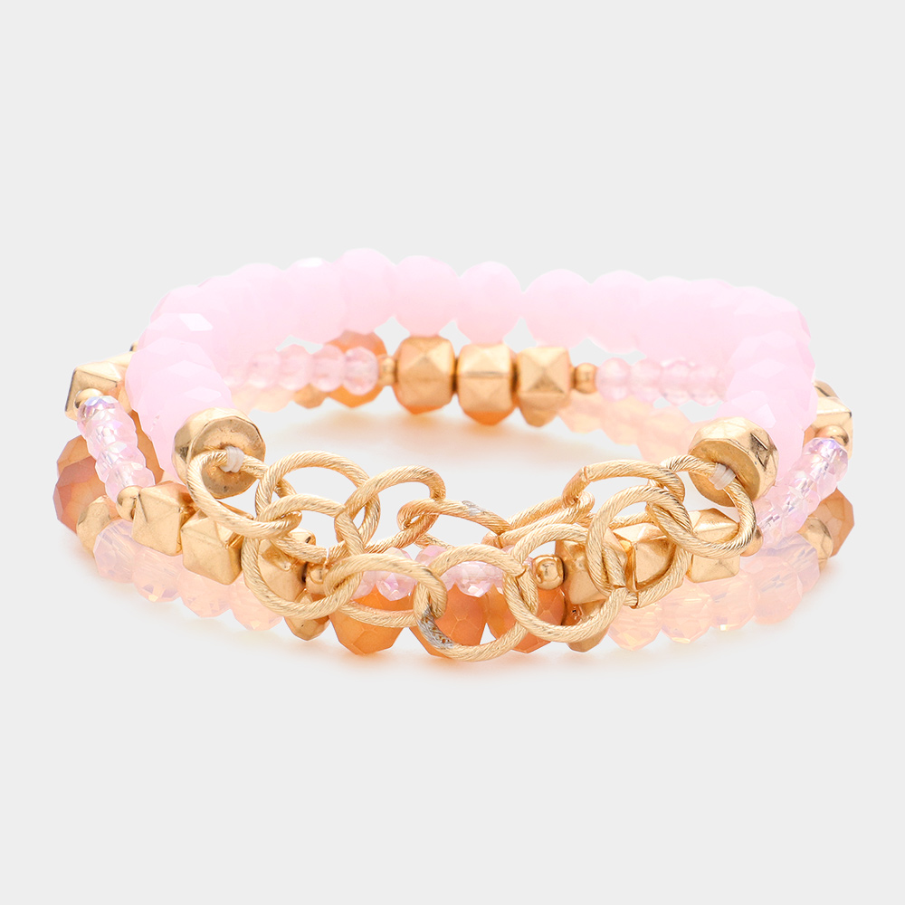 3PCS - Open Circle Link Metal Cube Faceted Beaded Stretch Bracelets