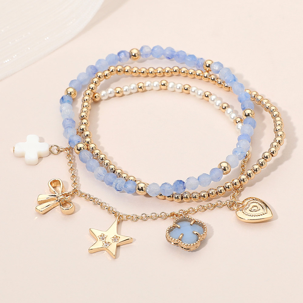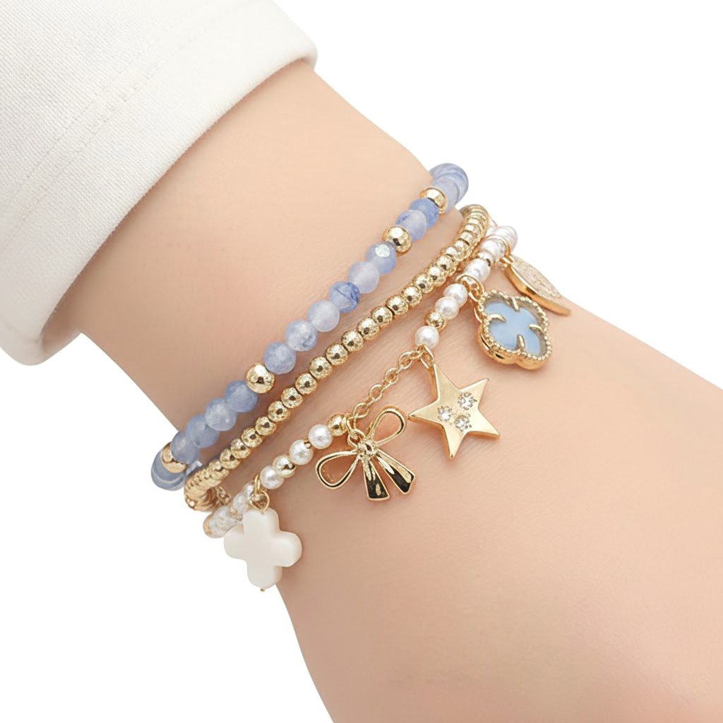 3PCS - Quatrefoil Bow Heart Cross Charm Pearl Metal Ball Faceted Beaded Stretch Multi Layered Bracelets