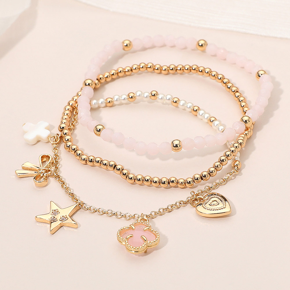 3PCS - Quatrefoil Bow Heart Cross Charm Pearl Metal Ball Faceted Beaded Stretch Multi Layered Bracelets