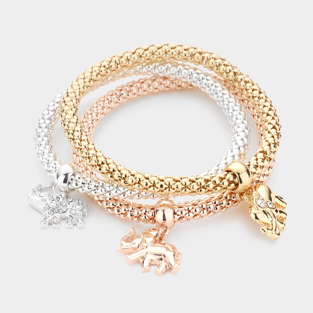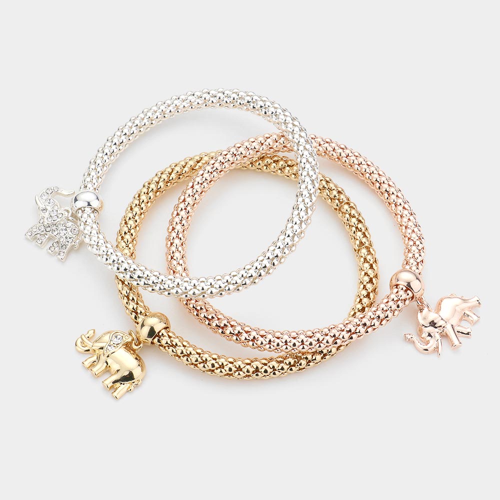 3PCS - Rhinestone Embellished Metal Elephant Charm Stretch Bracelets