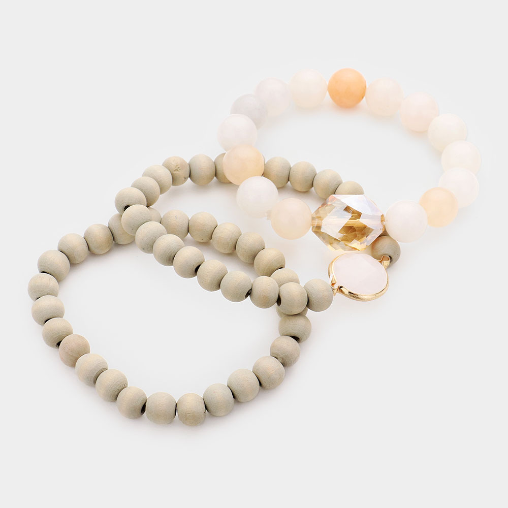 3PCS - Semi Precious Wood Beaded Layered Bracelets