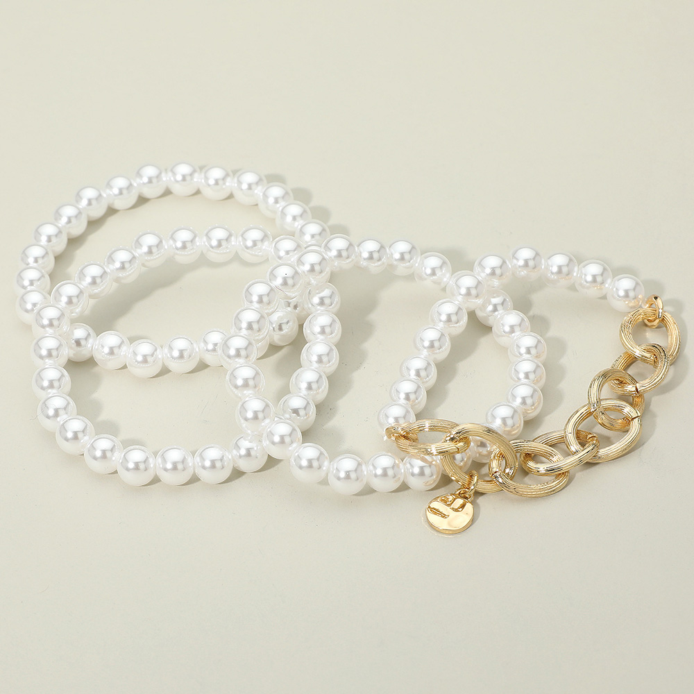 Details • Size : 1.25" H • Stretchable • Refine your look with this triple layer pearl and chain bracelet. Featuring elegant strands of glossy pearls intertwined with textured links, it exudes timeless charm and sophistication—perfect for pairing with formal wear or adding a chic accent to your everyday ensemble. • Lead and Nickel Compliant