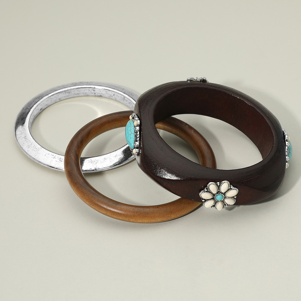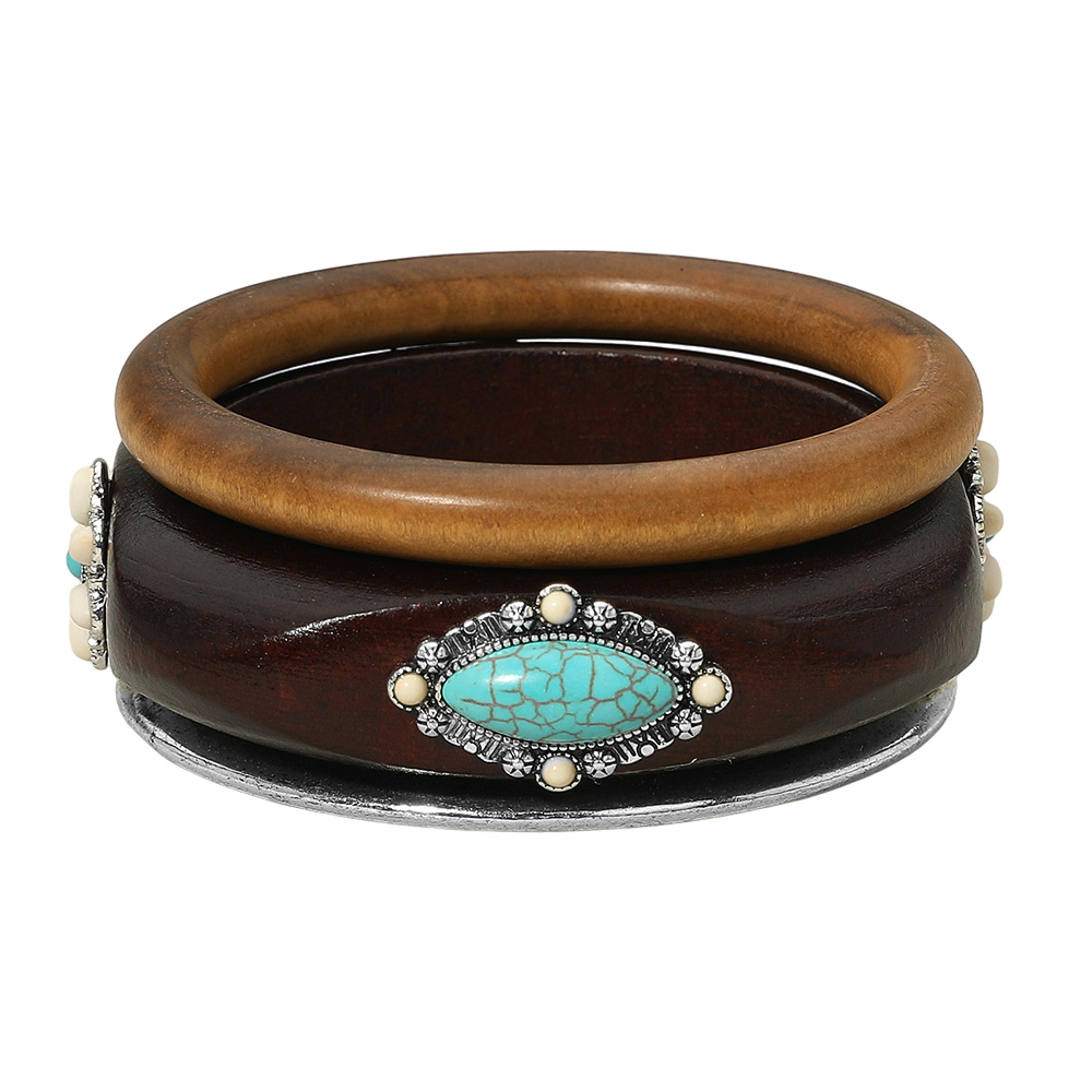 3PCS - Western Oval Turquoise Stone Accent Stackable Wooden Bangle Multi Layered Bracelets