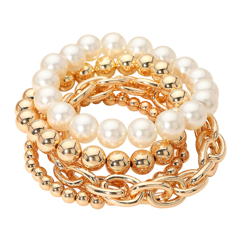 Details • Size : 1.5" H • Stretchable • This bracelet set combines smooth beads, sculpted accents, and chain detailing to create a polished stacked look. Designed for effortless styling, each piece adds dimension and texture, making the set ideal for both casual outfits and refined ensembles. • Lead and Nickel Compliant