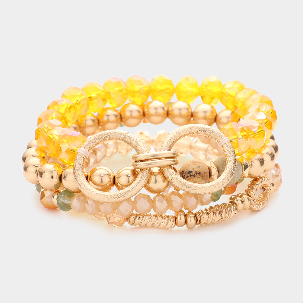 4PCS - Semi Precious Stone Pointed Double Open Metal Circle Link Faceted Beaded Stretch Bracelets