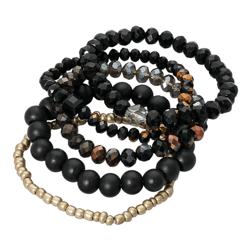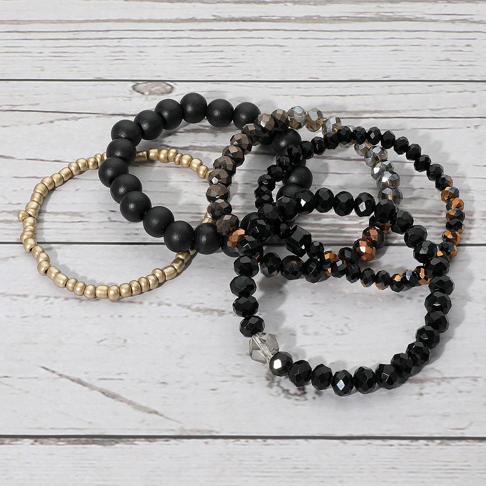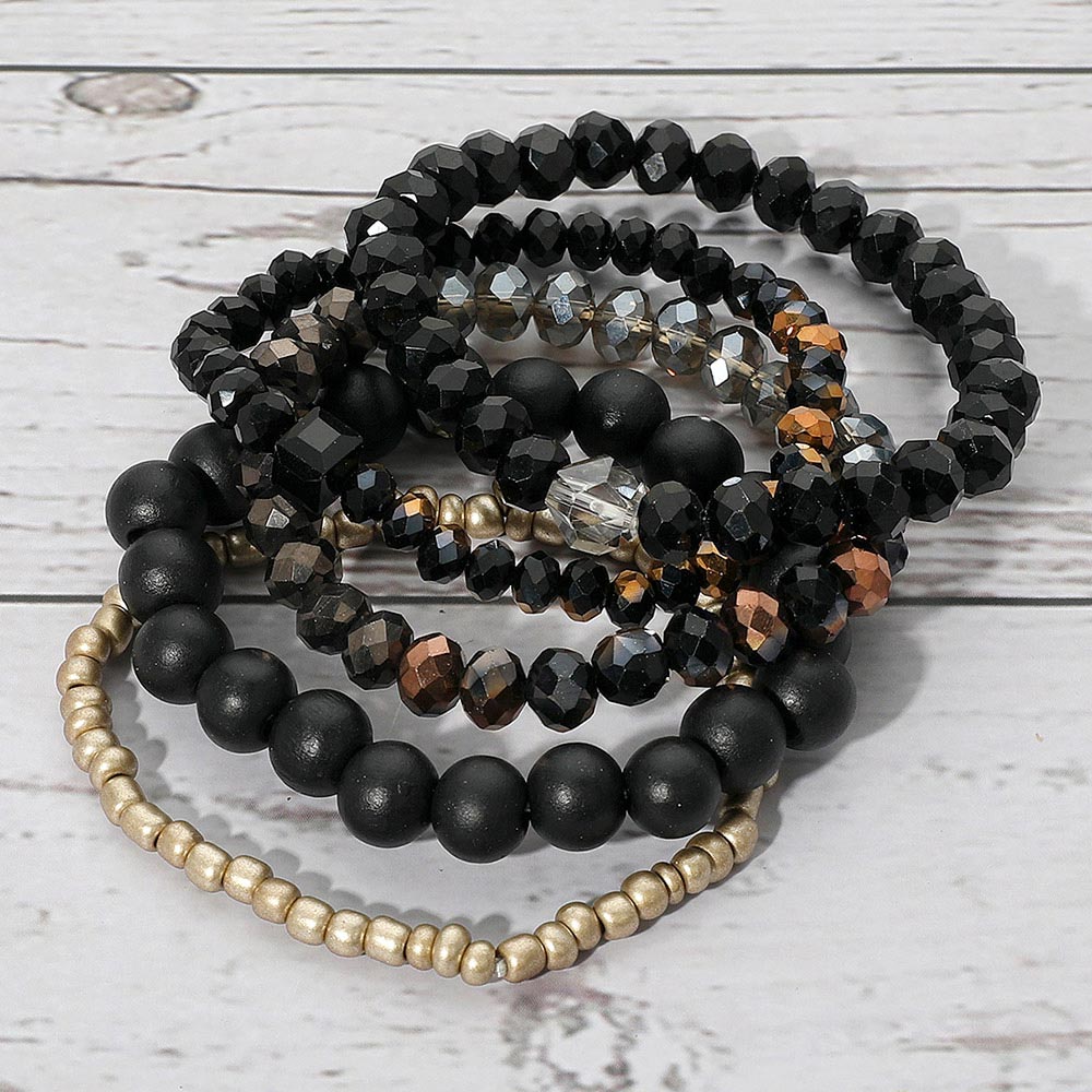• Multi-strand beaded bracelet set featuring a mix of wood, glass, and metallic beads in varied textures. Easy to stack or wear solo for a natural yet polished look.