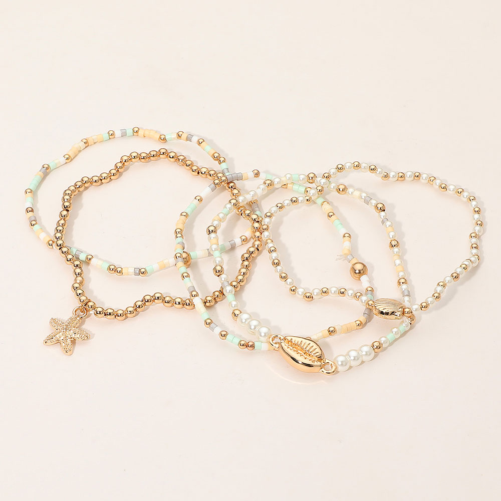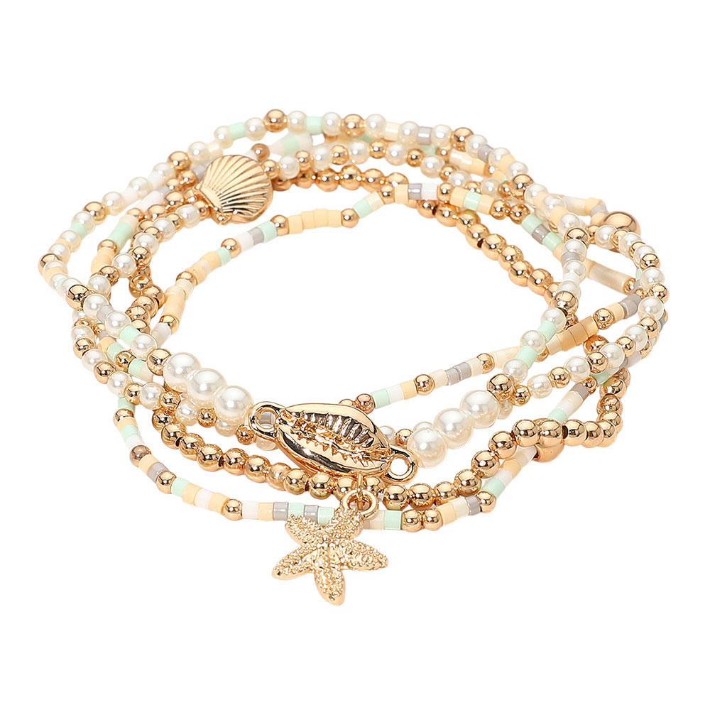 5PCS - Starfish Seashell Charm Pearl Seed Beaded Stretch Multi Layered Bracelets
