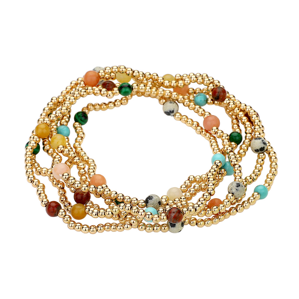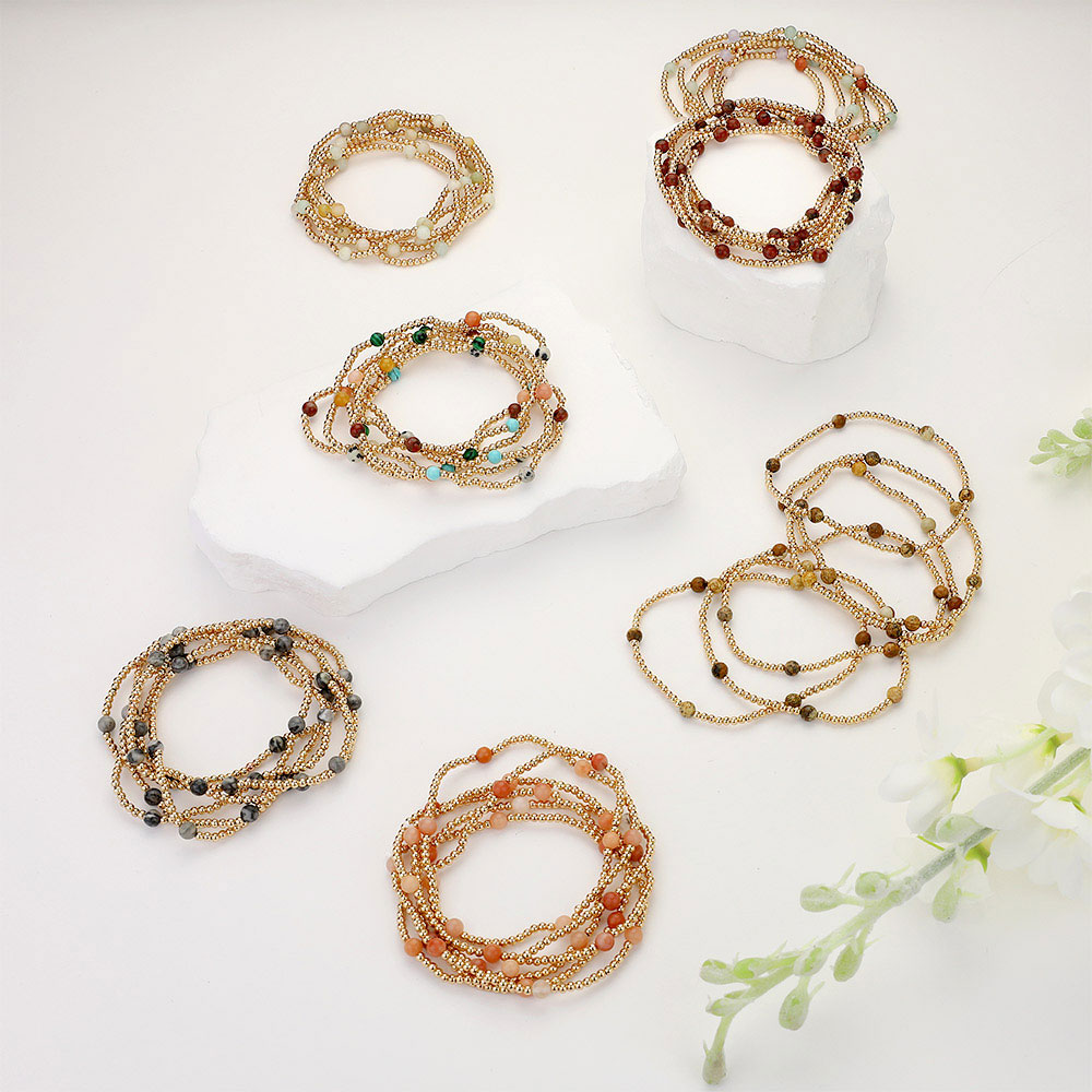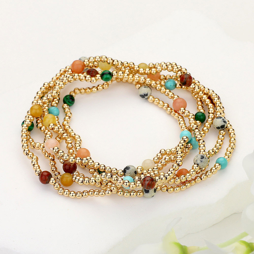 6PCS - Natural Stone Metal Ball Beaded Stretch Multi Layered Bracelets
