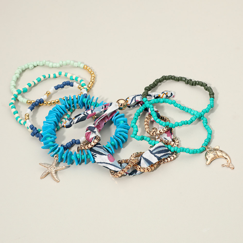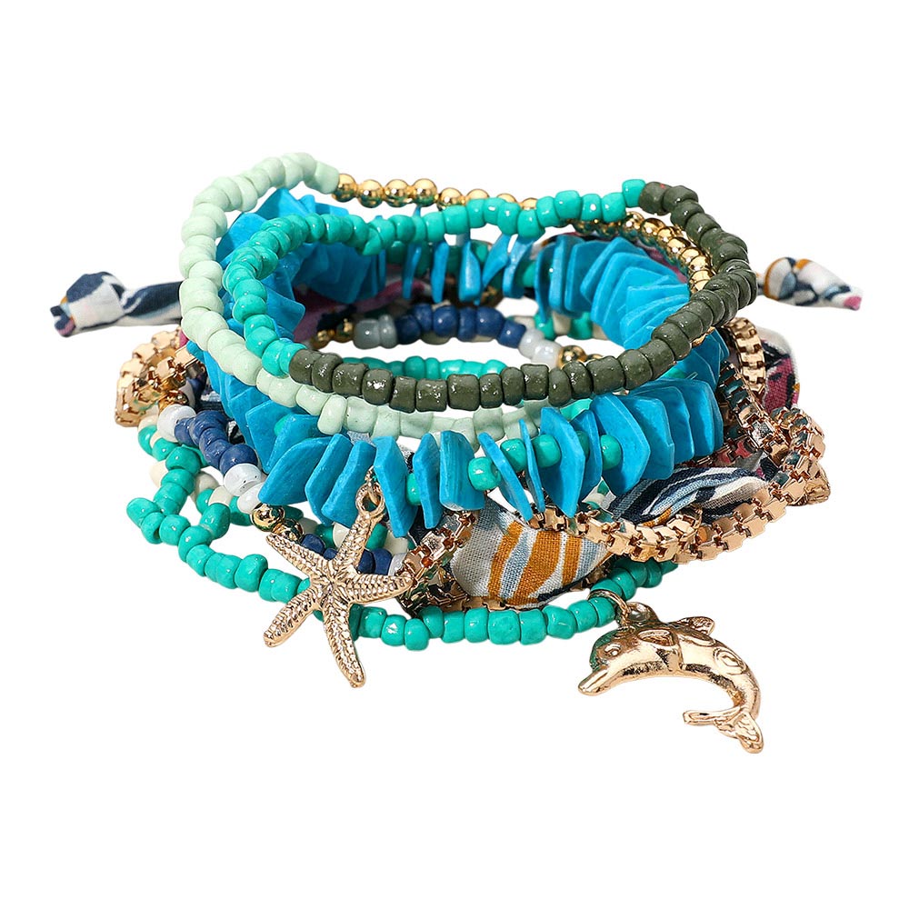 Details • Size 1 : 1.5" H / Stretchable • Size 2 : 0.75" H / Adjustable • Boho ocean charm bracelet set featuring layered beaded strands with starfish and dolphin accents, textured details, and fabric-wrapped elements for a fun beach-inspired look. Perfect for stacking and everyday styling, adding a relaxed coastal vibe to outfits, vacations, festivals, and gift occasions. • Lead and Nickel Compliant • Made In India