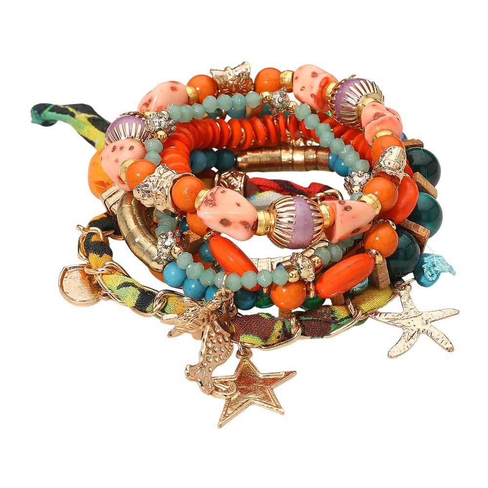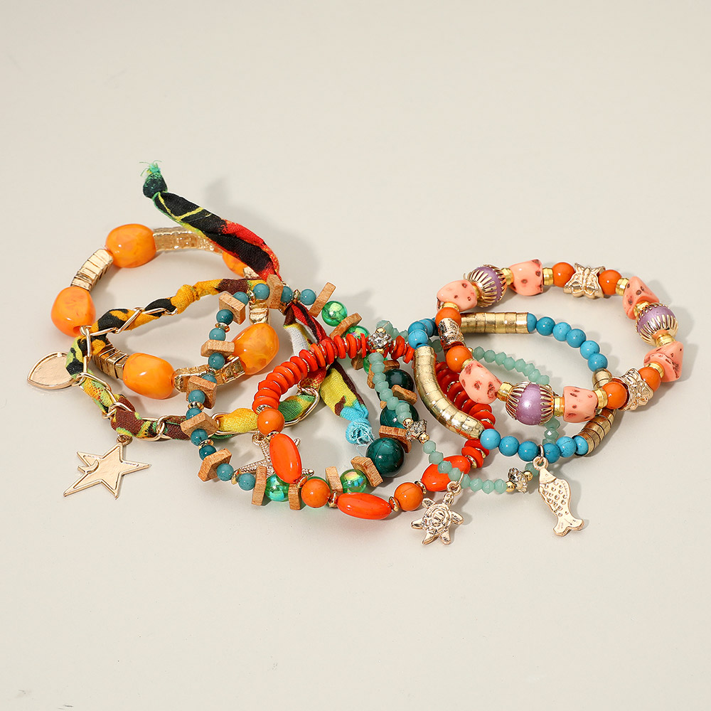 Details • Size 1 : 1.75" H / Stretchable • Size 2 : 0.3" H / Adjustable • Boho starfish heart star turtle fish charm bracelet set featuring layered beaded strands, fabric-wrapped details, playful shapes, and ocean-inspired charms for a vibrant, handcrafted look. Perfect for stacking, everyday styling, and gifting, adding a unique beachy flair to casual outfits, festivals, and vacation fashion. • Lead and Nickel Compliant • Made In India