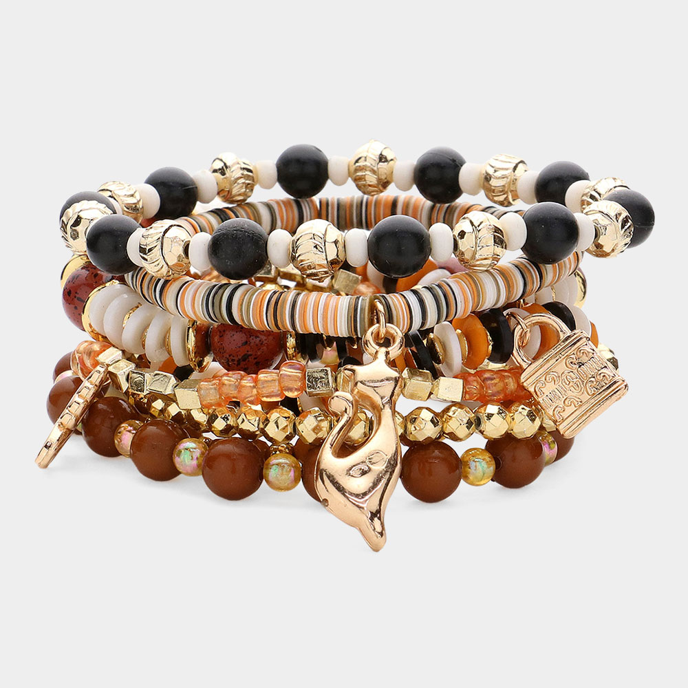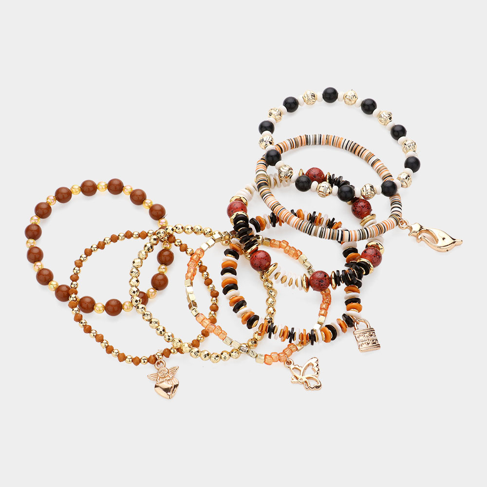 8PCS - Metal Angel Heart Lock Cat Charm Pointed Various Beaded Stretch Multi Layered Bracelets