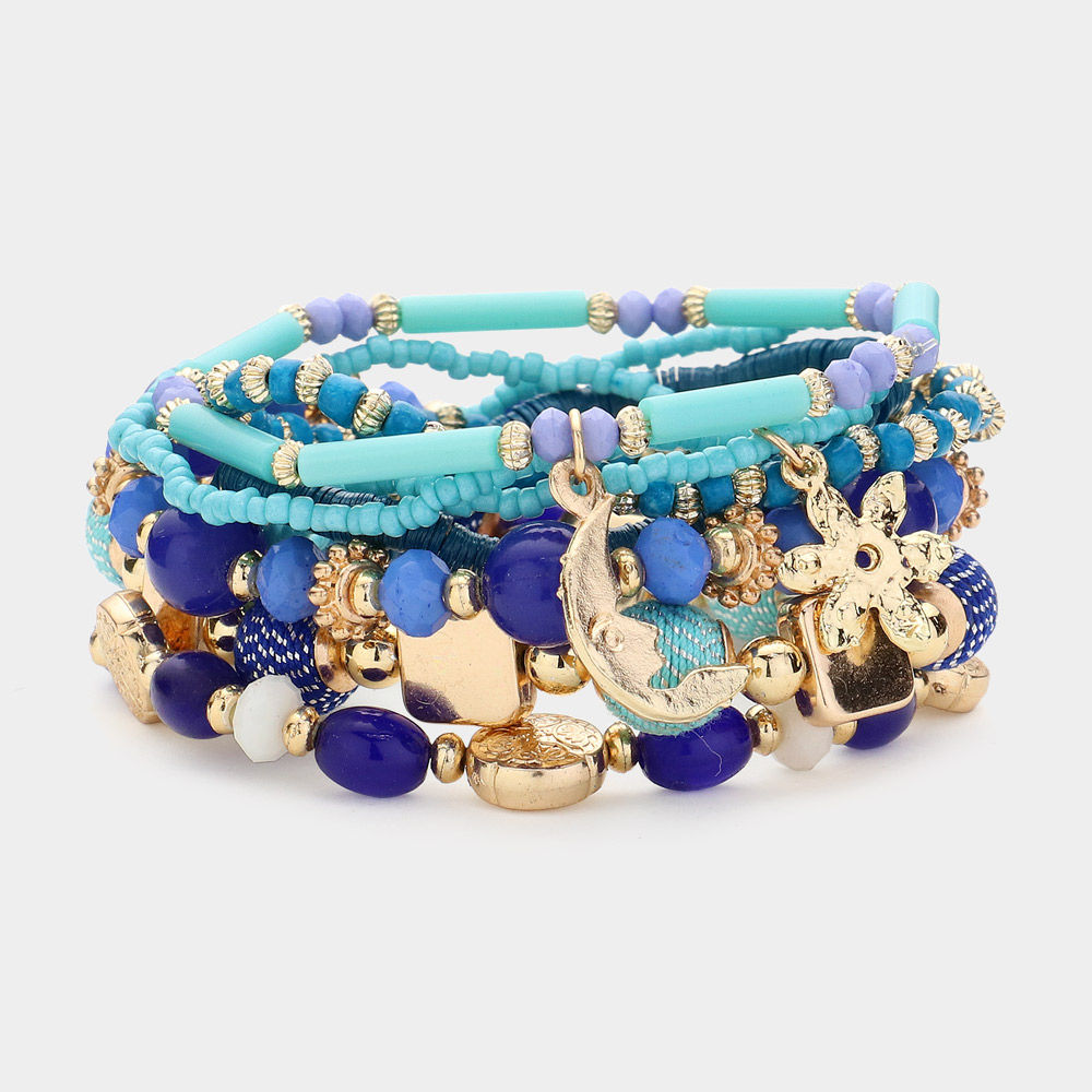 8PCS - Metal Flower Moon Leaf Charm Multi Beaded Layered Bracelets