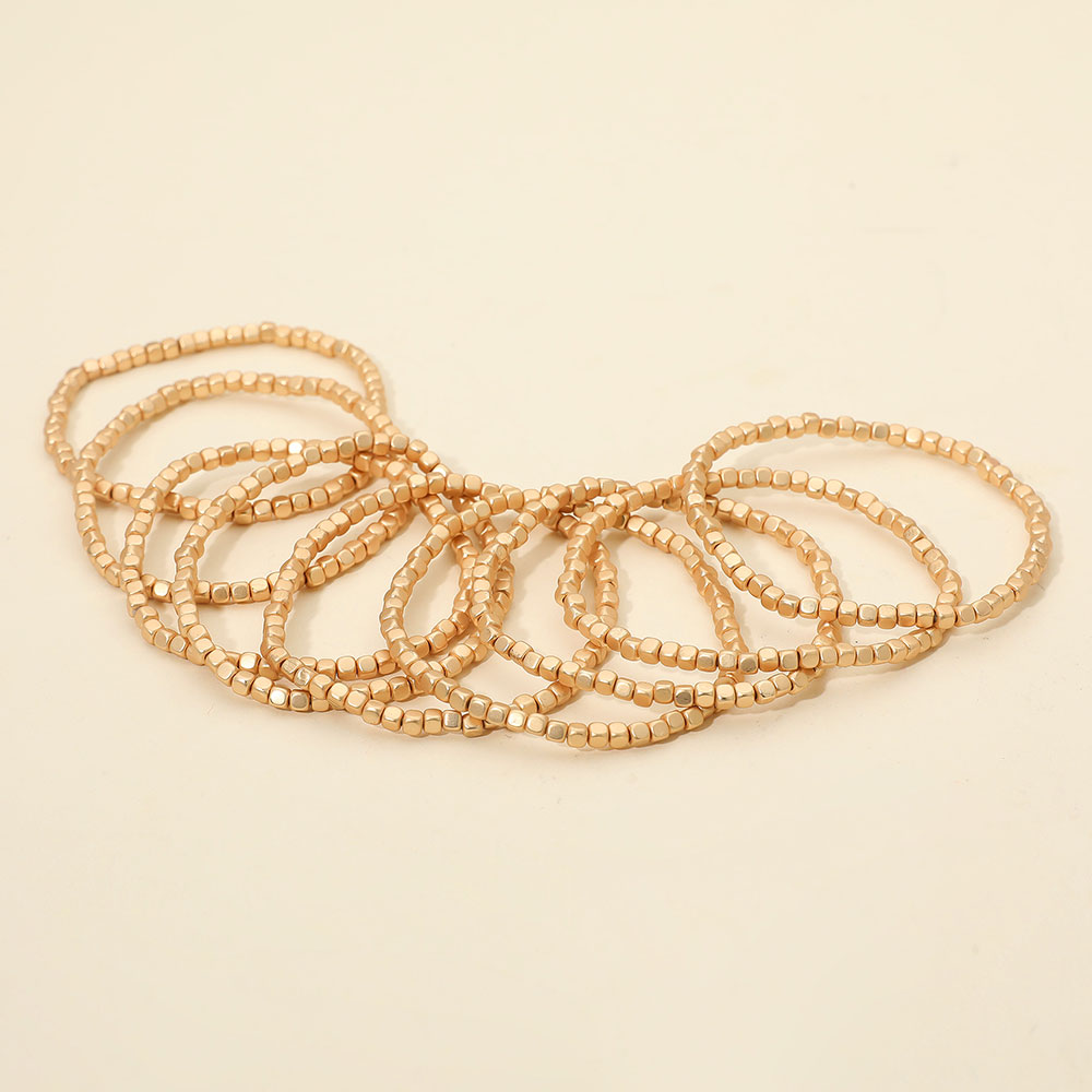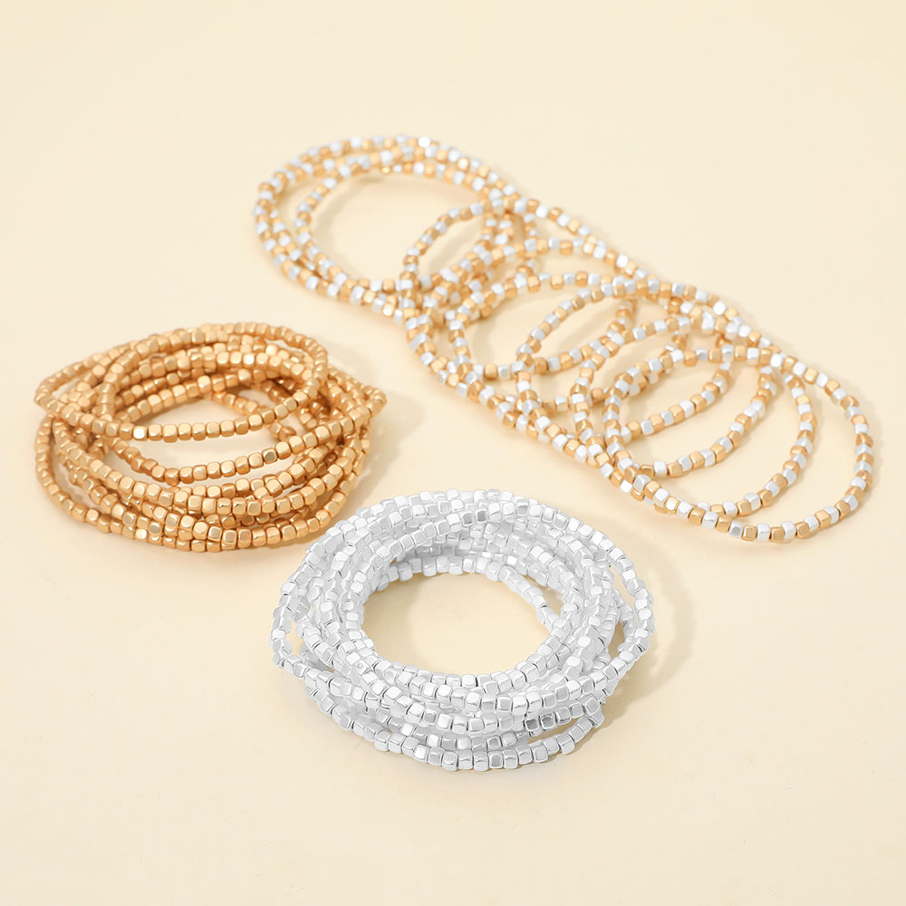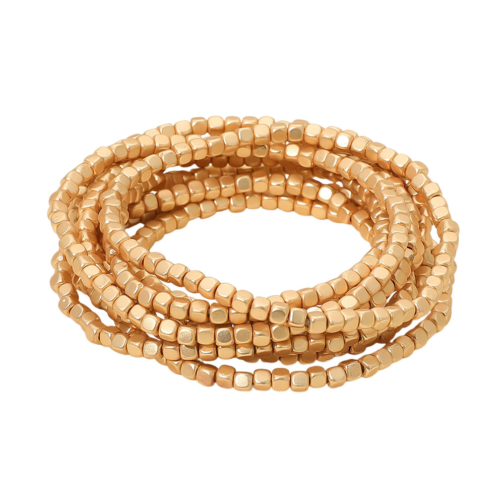 • Add shimmer to your style with this multi-strand beaded stretch bracelet set featuring sleek metallic cube beads. Lightweight and easy to wear, it wraps comfortably around the wrist for a bold layered look. Perfect for stacking or wearing solo in any casual or dressy outfit.