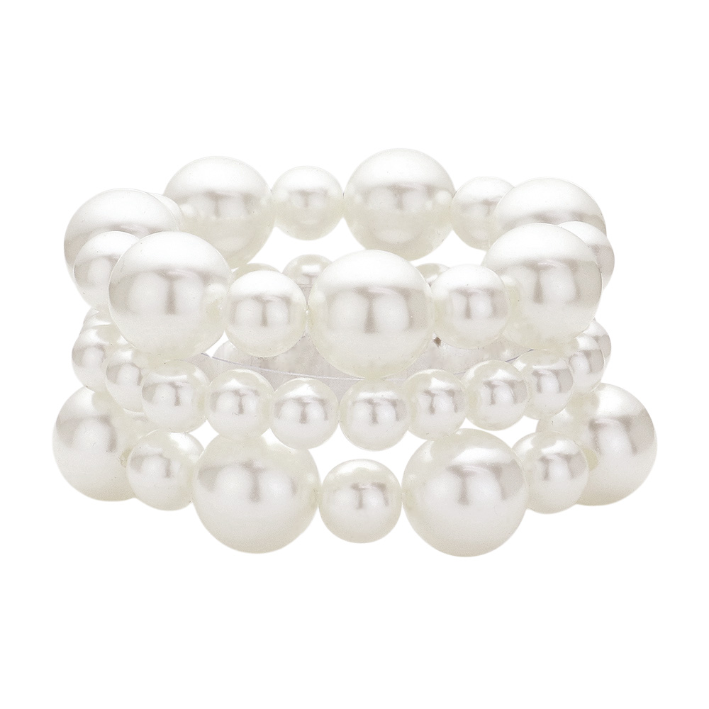 • Elegant triple row stretch bracelet featuring round pearl-like beads in alternating sizes. A timeless piece that adds sophistication to casual wear, weddings, parties, and formal occasions.