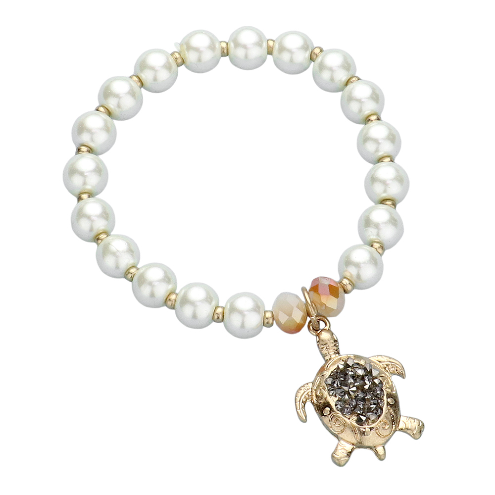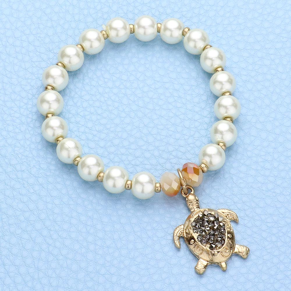 Faux Pearl Stone Cluster Turtle Charm Stretch Bracelet