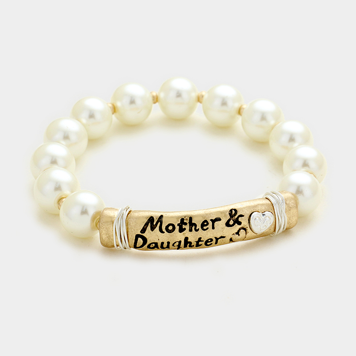 "Mother & Daughter" heart message bar pearl stretch bracelet