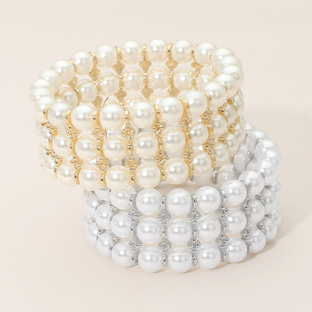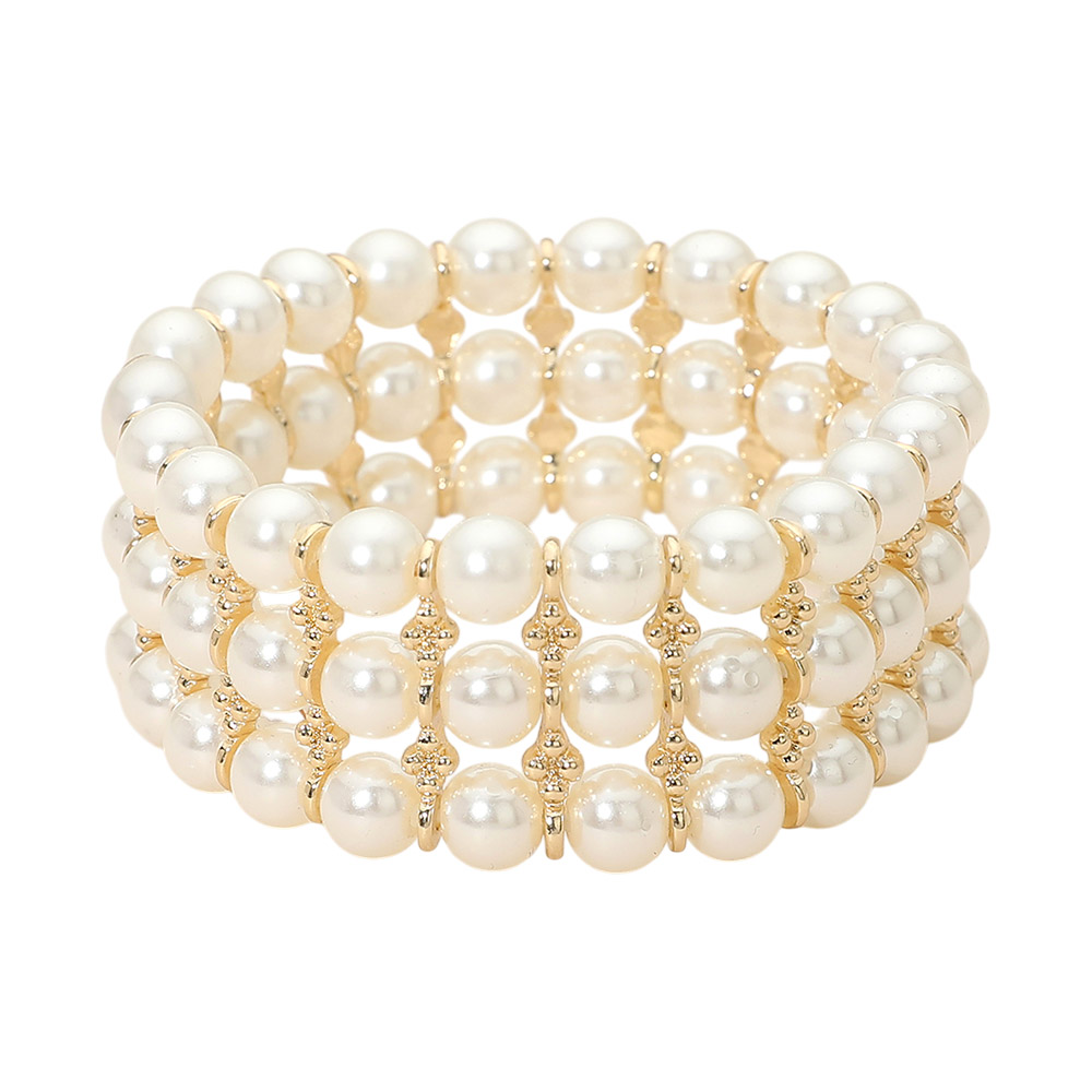 Details • Size : 1" H • Stretchable • Elegant stretch bracelet designed with layered round pearl-style beads and refined spacer accents for a timeless, polished look. The flexible slip-on fit offers comfort and easy wear, making it perfect for everyday styling, special occasions, or stacking with other bracelets. A versatile accessory that adds effortless sophistication to any outfit. • Lead and Nickel Compliant