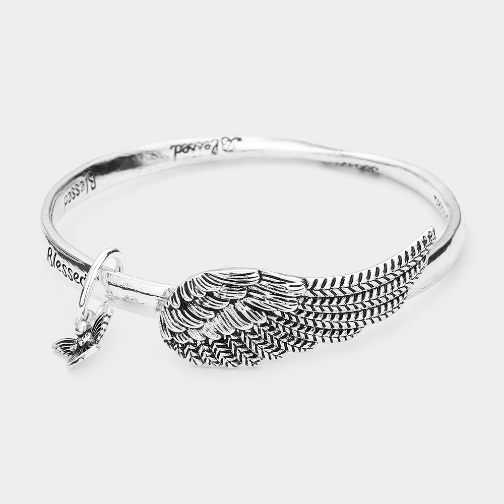 Blessed Message Metal Wing Accented Angel Charm Bangle Bracelet