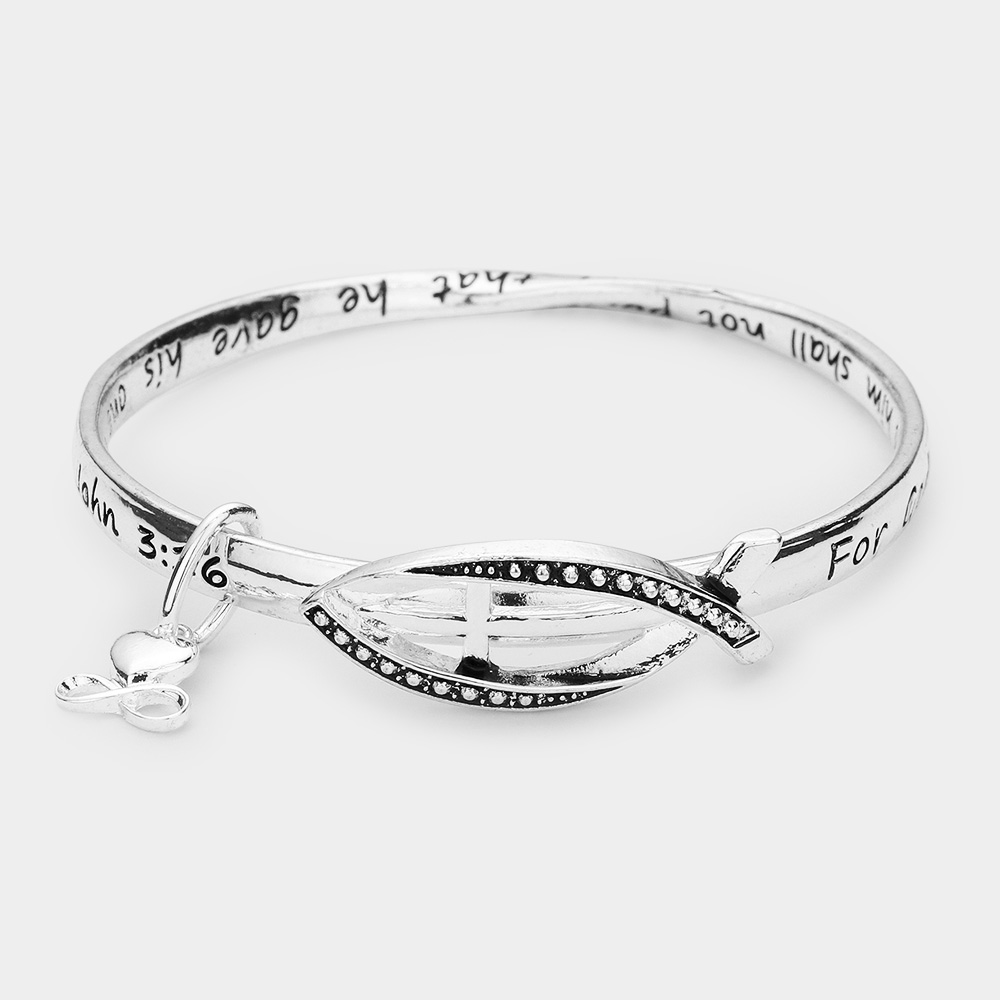 Details • Size : 0.5" H, 2.5" D • Keep your faith close with this John 3:16 stretch bracelet. Engraved with the uplifting verse, it serves as a timeless symbol of love and belief. Perfect for daily wear or gifting, this meaningful accessory reminds you of hope and grace wherever you go. • Lead and Nickel Compliant