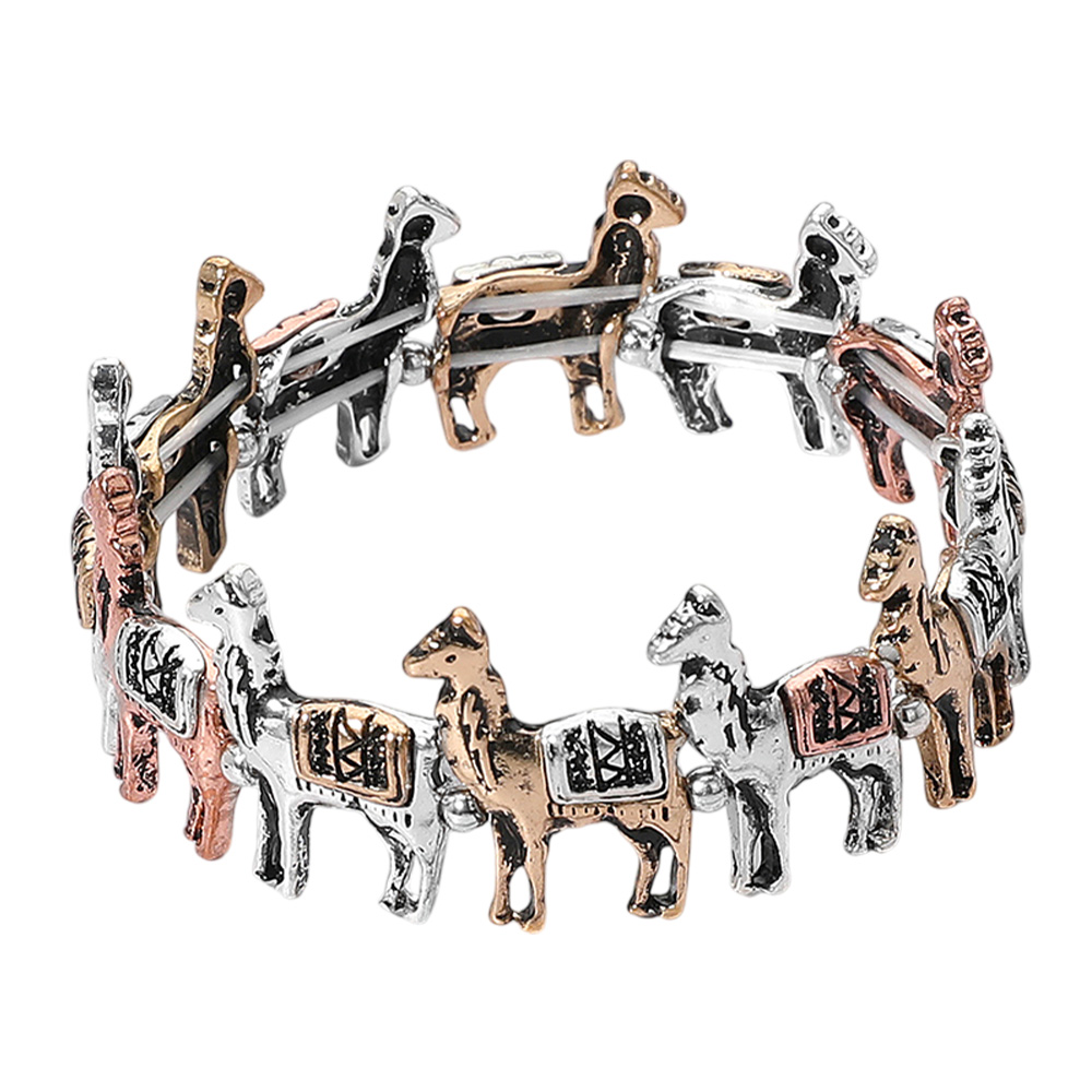Details • Size : 0.75" H • Stretchable • Stretch bracelet featuring a row of llama-shaped charms with etched tribal designs. Unique mixed-metal finish adds character and charm to this playful piece. Comfortable fit for everyday wear. • Lead and Nickel Compliant
