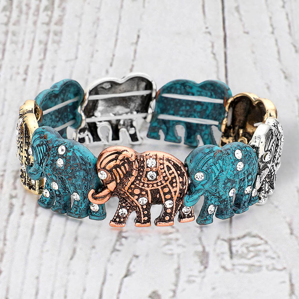 Details • Size : 0.75" H • Stretchable • Charming stretch bracelet featuring linked elephant motifs with engraved accents, symbolizing luck and strength. A unique accessory that adds personality and boho flair to any look, perfect for gifting or wearing as a meaningful everyday statement piece. • Lead and Nickel Compliant