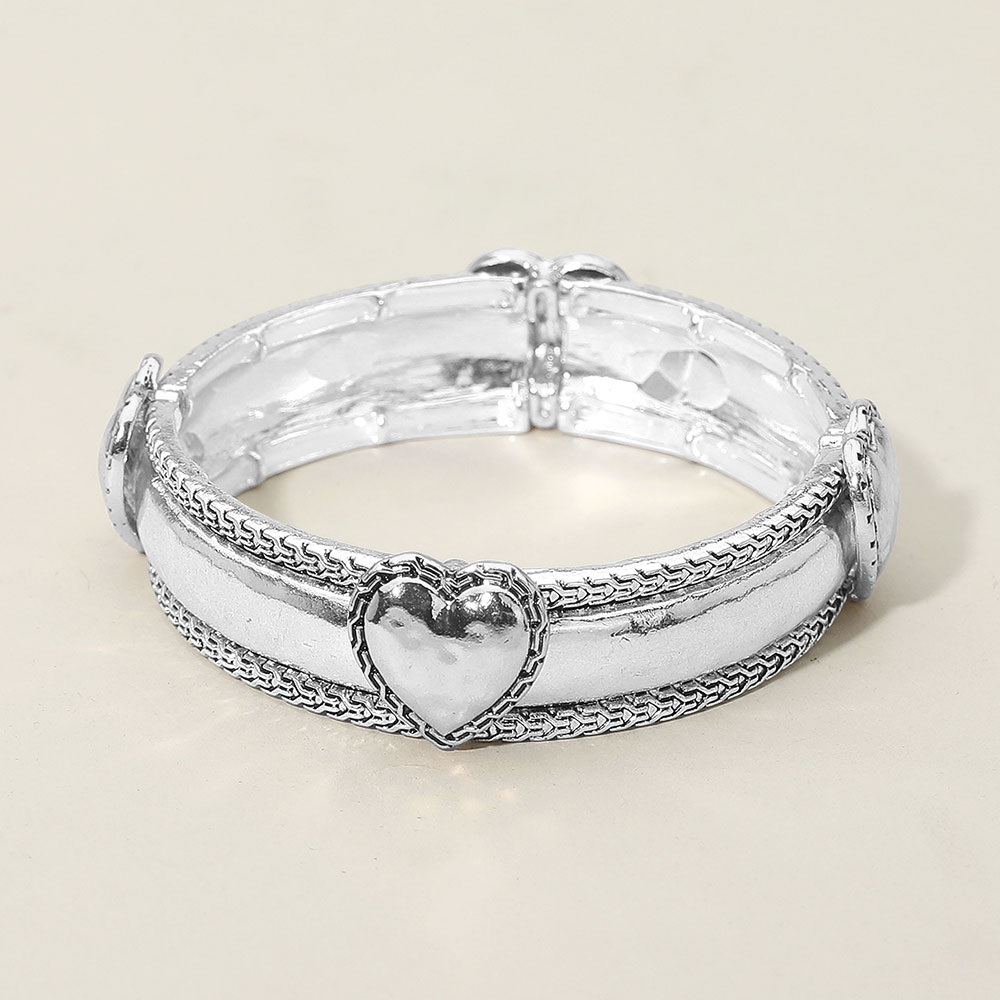 Details • Size : 0.75" H • Stretchable • Showcase timeless charm with this heart accent stretch bracelet featuring textured detailing and framed heart motifs. Designed with a flexible slip-on fit for easy comfort, it pairs effortlessly with casual or dressy looks and makes a thoughtful everyday accessory or gift. • Lead and Nickel Compliant