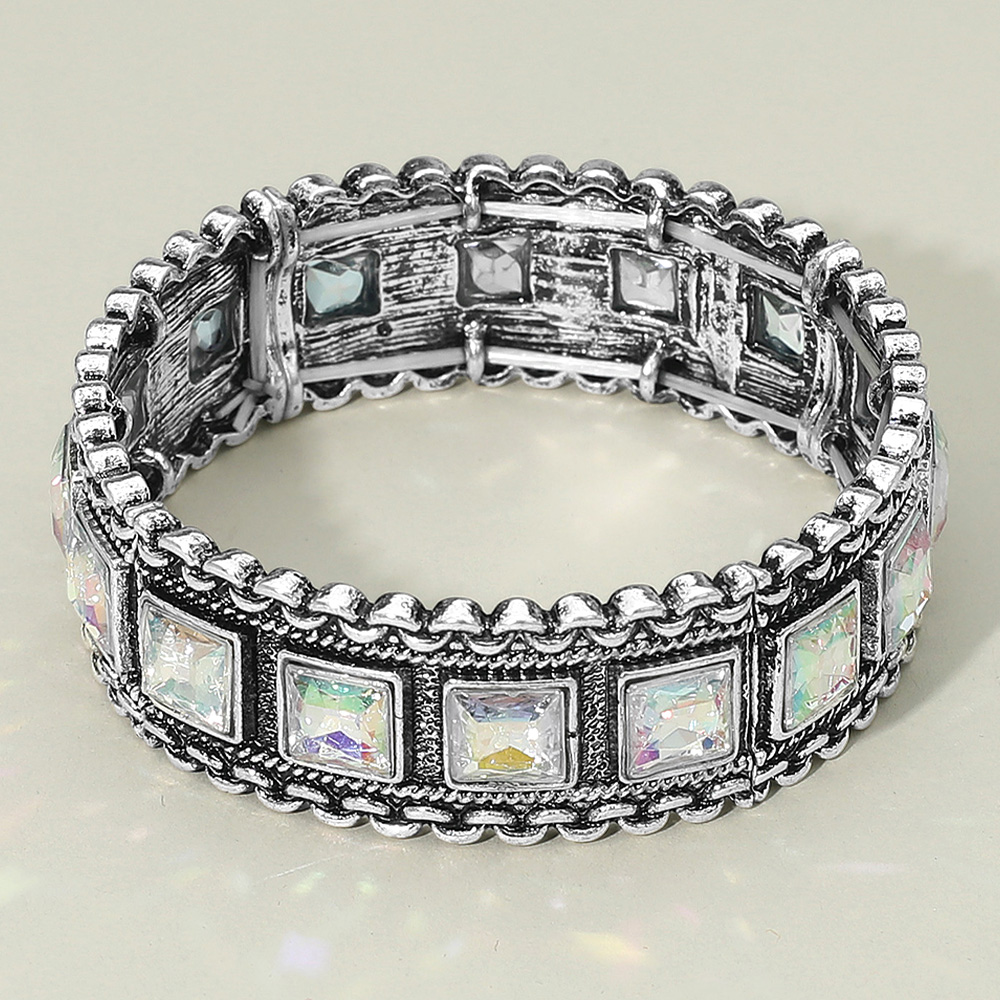 • Bracelet with textured antique finish, featuring square inset stones and braided edge detailing. A bold and elegant accessory that brings vintage flair to both casual and formal looks.