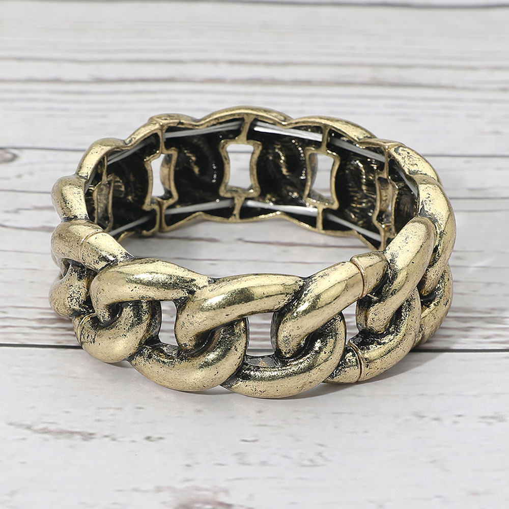Details • Size : 0.9" H • Stretchable • Bold chunky chain link bracelet featuring an oversized interlocking design that delivers a strong statement look. The stretch construction allows for easy slip-on wear and a comfortable fit. Perfect for elevating everyday outfits, layering with other bracelets, or adding a modern edge to curated boutique accessory collections. • Lead and Nickel Compliant