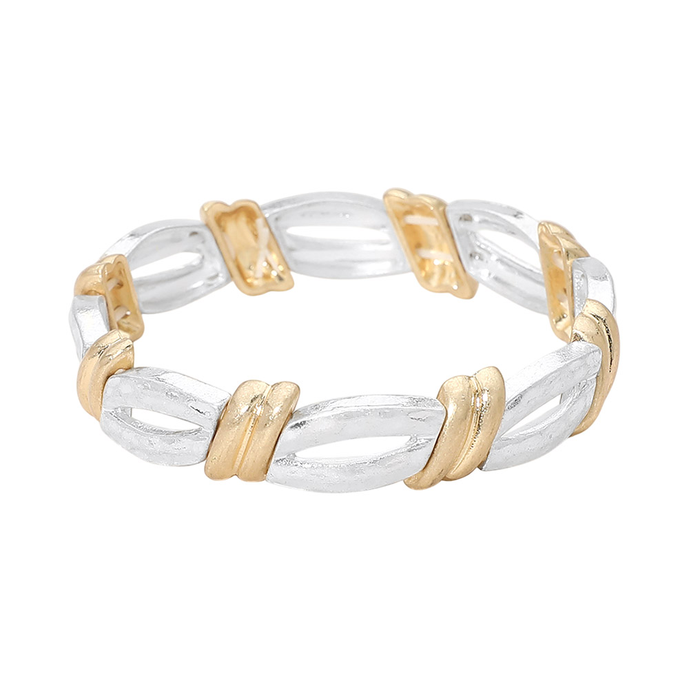 • Sleek stretch bracelet designed with repeating open links and smooth wrapped accents for a bold yet refined look. The flexible slip-on fit offers comfort and easy wear, making it ideal for everyday styling or statement layering. A versatile accessory that adds modern structure and effortless polish to any outfit.