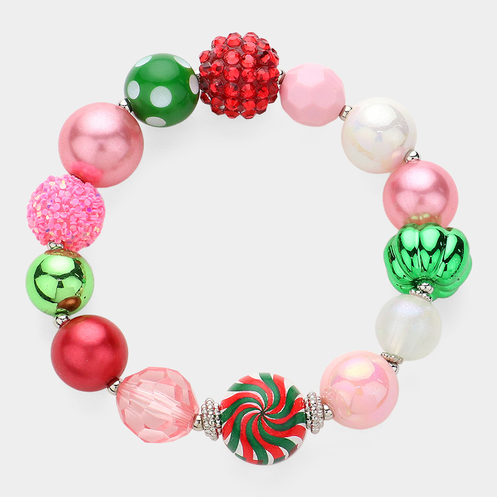 Details • Size : 0.7" H • Stretchable • Playful holiday stretch bracelet featuring assorted textured and glossy beads with festive accents. A cheerful statement piece perfect for seasonal outfits, parties, or gifting during celebrations. • Lead and Nickel Compliant