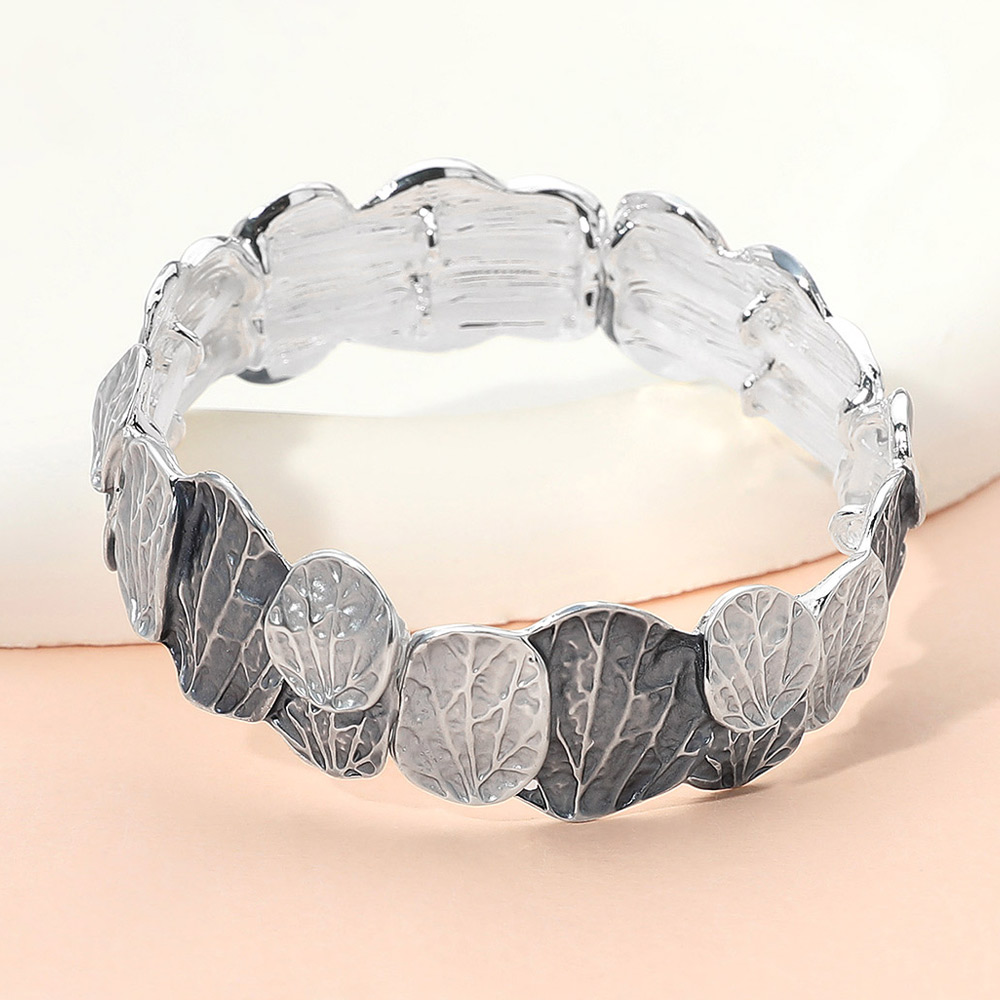 • Stylish stretch bracelet featuring textured leaf shapes in a mix of finishes. A bold yet nature-inspired accessory perfect for everyday wear or adding flair to your outfit.