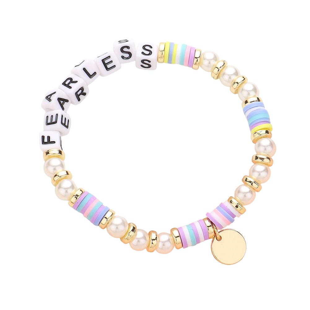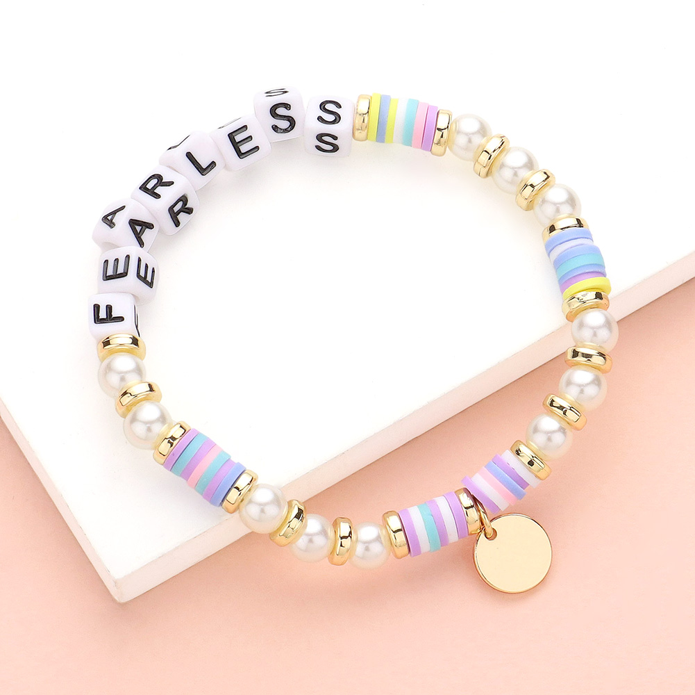 FEARLESS Message Pearl Heishi Beaded Metal Disc Plate Charm Stretch Bracelet