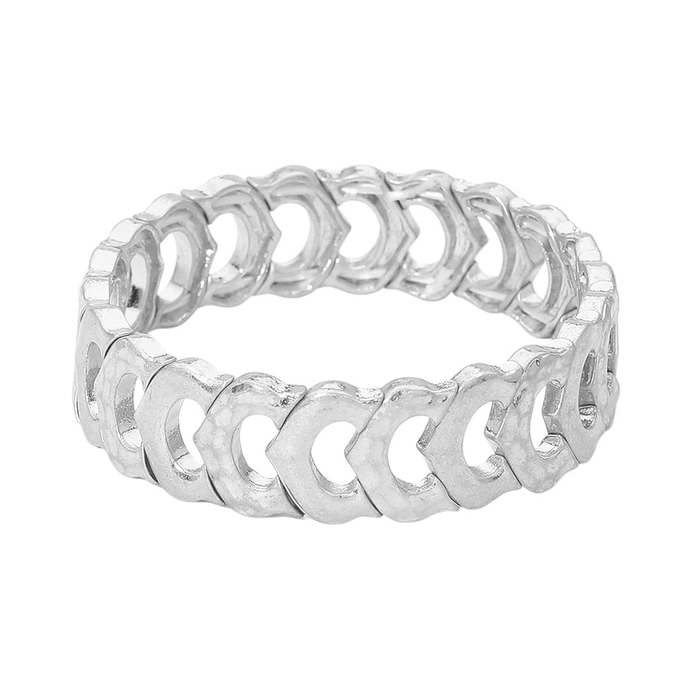 Details • Size : 0.6" H • Stretchable • Bold stretch bracelet featuring repeating links that create a sculptural, modern look. Designed with a flexible slip-on fit for comfort and easy wear. Perfect for stacking or wearing solo, this statement bracelet adds texture, movement, and contemporary edge to everyday outfits or elevated styling. • Lead and Nickel Compliant