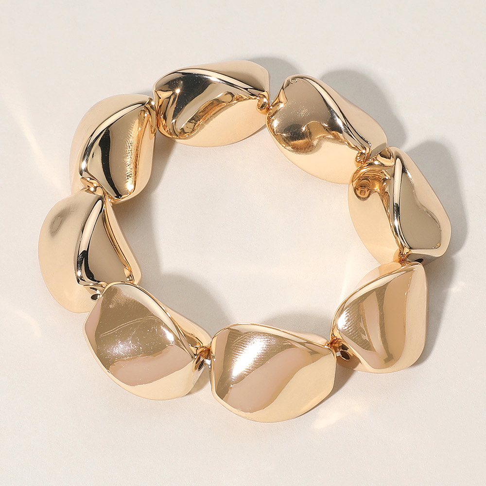 Details • Size : 0.7" H • Stretchable • This sculpted stretch bracelet features fluid, organic links in a striking two-tone finish. Designed for comfort and style, it offers a bold, contemporary look that pairs effortlessly with casual or dressy outfits. A versatile accessory with modern flair and artistic charm. • Lead and Nickel Compliant