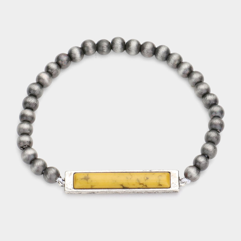 • Minimalist stretch bracelet featuring round beads with a sleek rectangular center bar accent. Its balanced geometric layout and smooth contour create a modern, versatile design ideal for stacking or standalone wear in casual and refined looks alike.