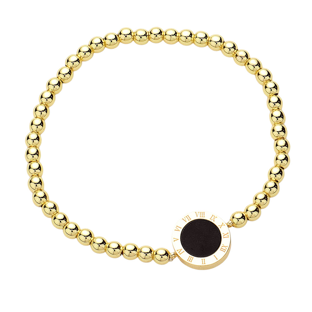 Details • Size : 0.5" H • Stretchable • This elegant gold beaded bracelet features a chic disc charm with Roman numerals, offering a unique twist to your accessories collection. A perfect fusion of timeless sophistication and modern style, this bracelet adds a touch of class to any outfit, making it ideal for both casual and formal occasions. • Stainless Steel