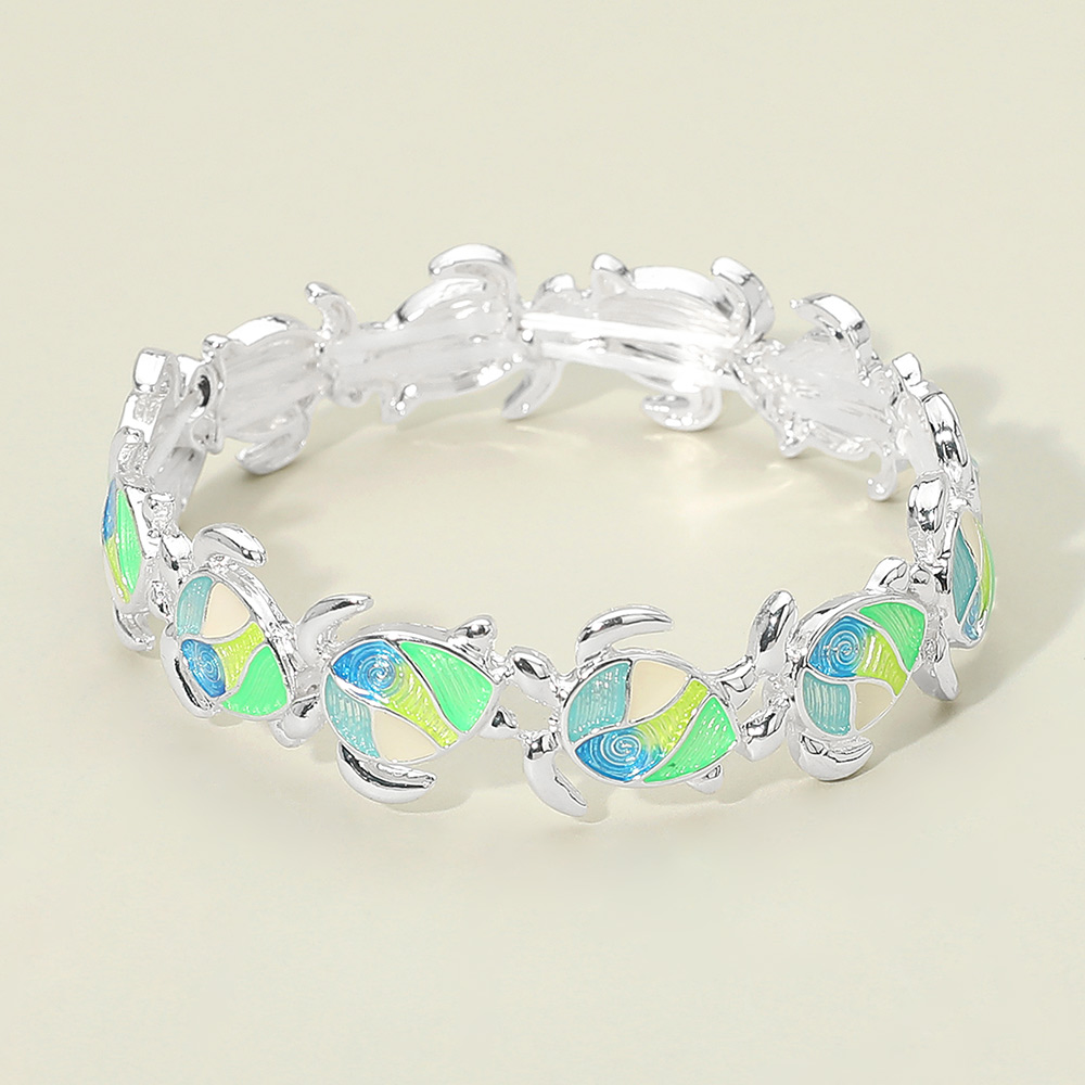 Details • Size : 0.75" H, 2.25" D • Stretchable • Sea turtle stretch bracelet featuring repeating turtle motifs with smooth linked detailing for a playful yet polished look. Designed for easy wear and everyday styling, this bracelet adds a coastal-inspired accent to casual outfits, vacation assortments, or gift-ready collections. A great choice for boutiques seeking charming, trend-forward accessories with broad customer appeal. • Lead and Nickel Compliant