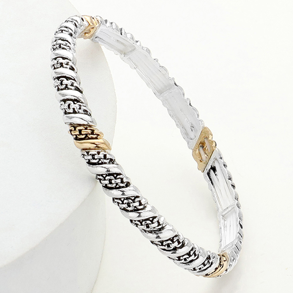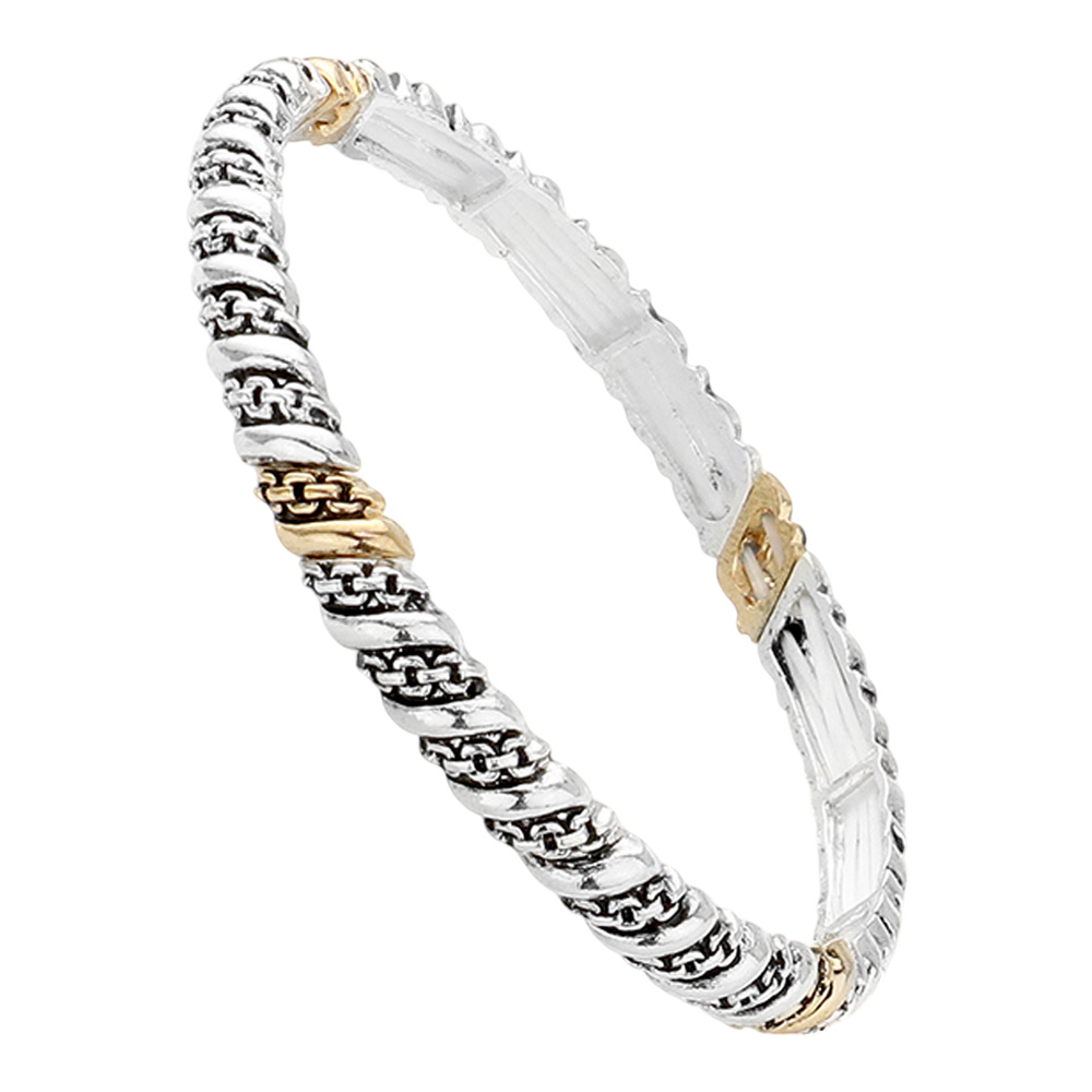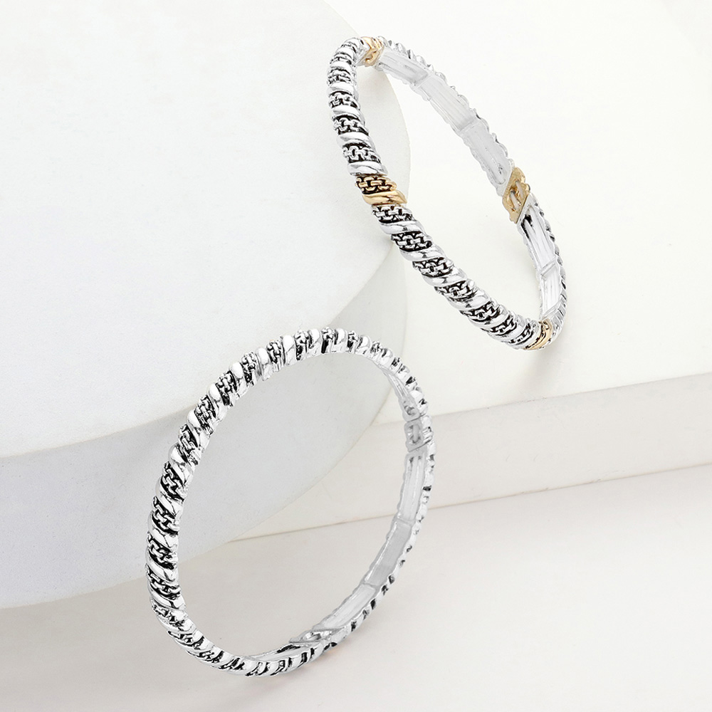 Two Tone CZ Stone Paved Tip Textured Cuff Bracelet