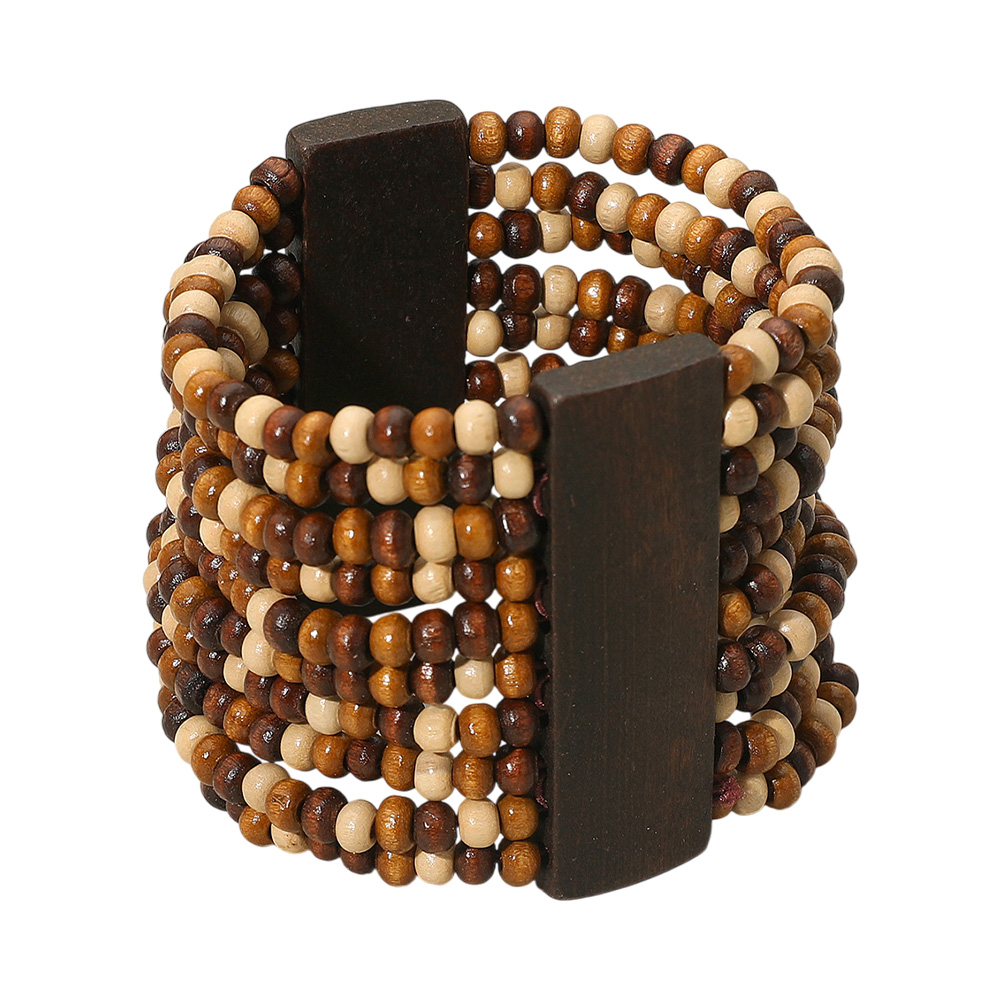 Details • Size : 2.25" H • Stretchable • Add a touch of nature-inspired style with this wide beaded bracelet, crafted from smooth beads in warm earthy tones. Designed with multiple rows and sturdy wooden accents, it brings a bold yet versatile look, perfect for everyday wear or enhancing bohemian-inspired outfits. • Lead and Nickel Compliant