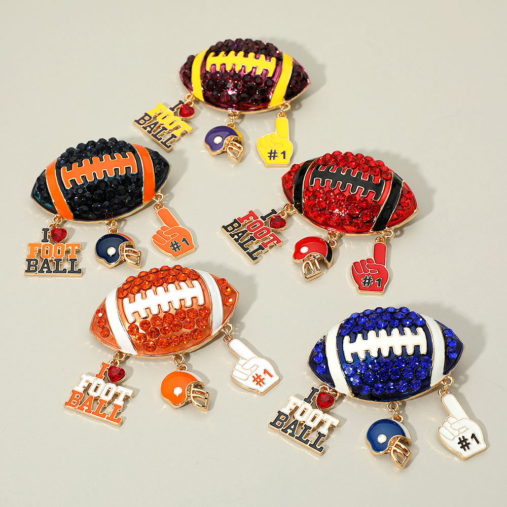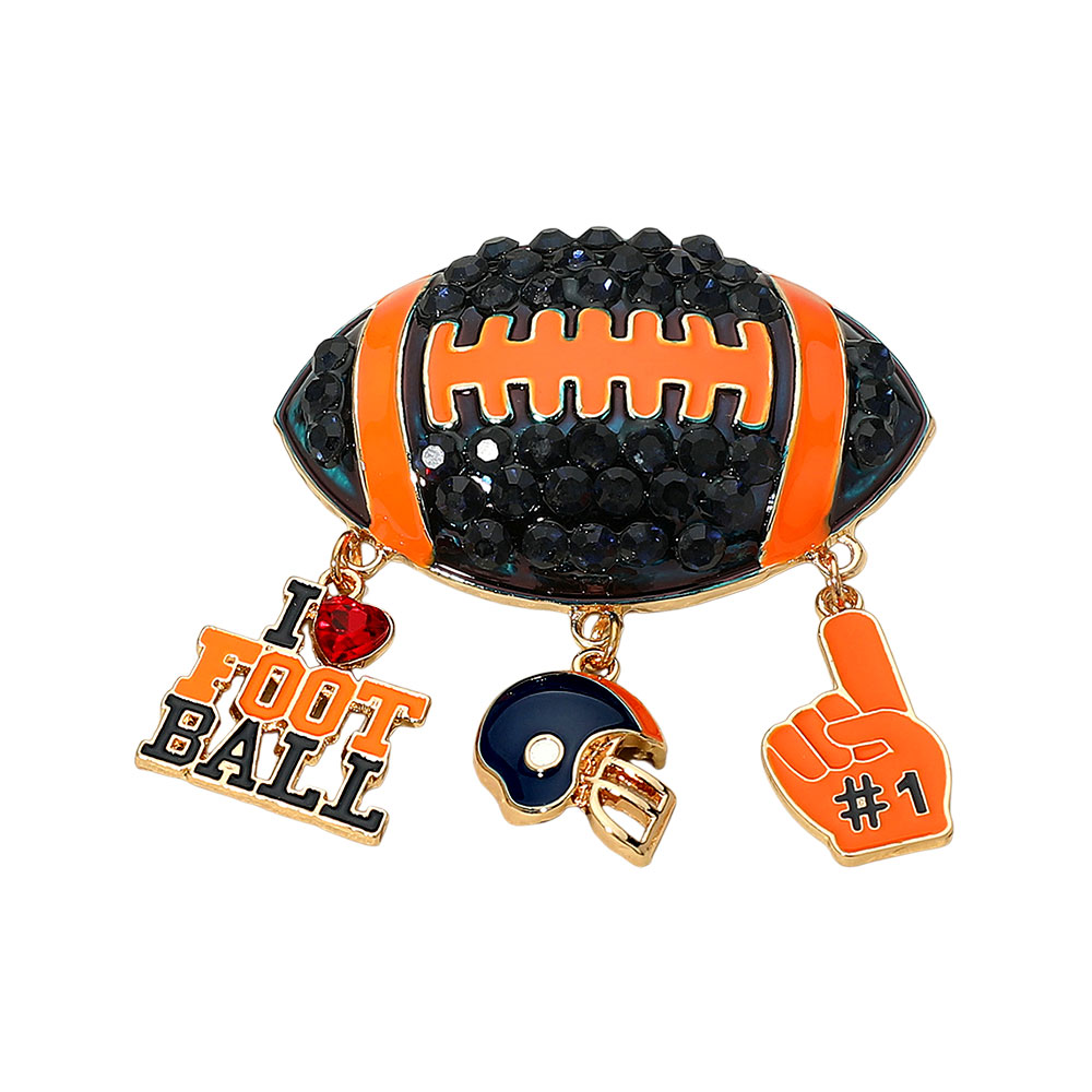 • Sporty football brooch featuring rhinestone football design with dangling charms including helmet, #1 foam finger, and “I Love Football.” Perfect accessory for gameday outfits, tailgates, or fan gear.