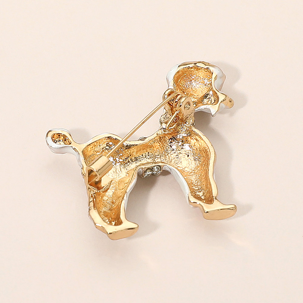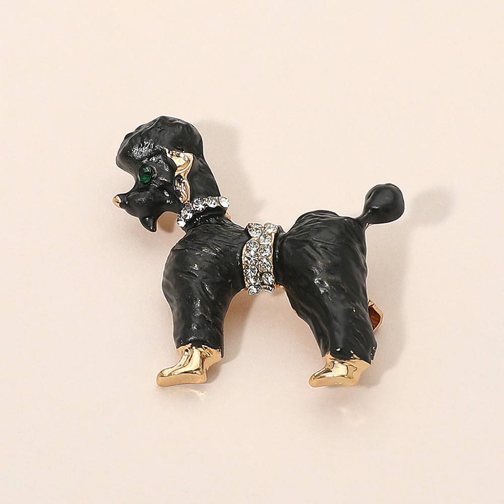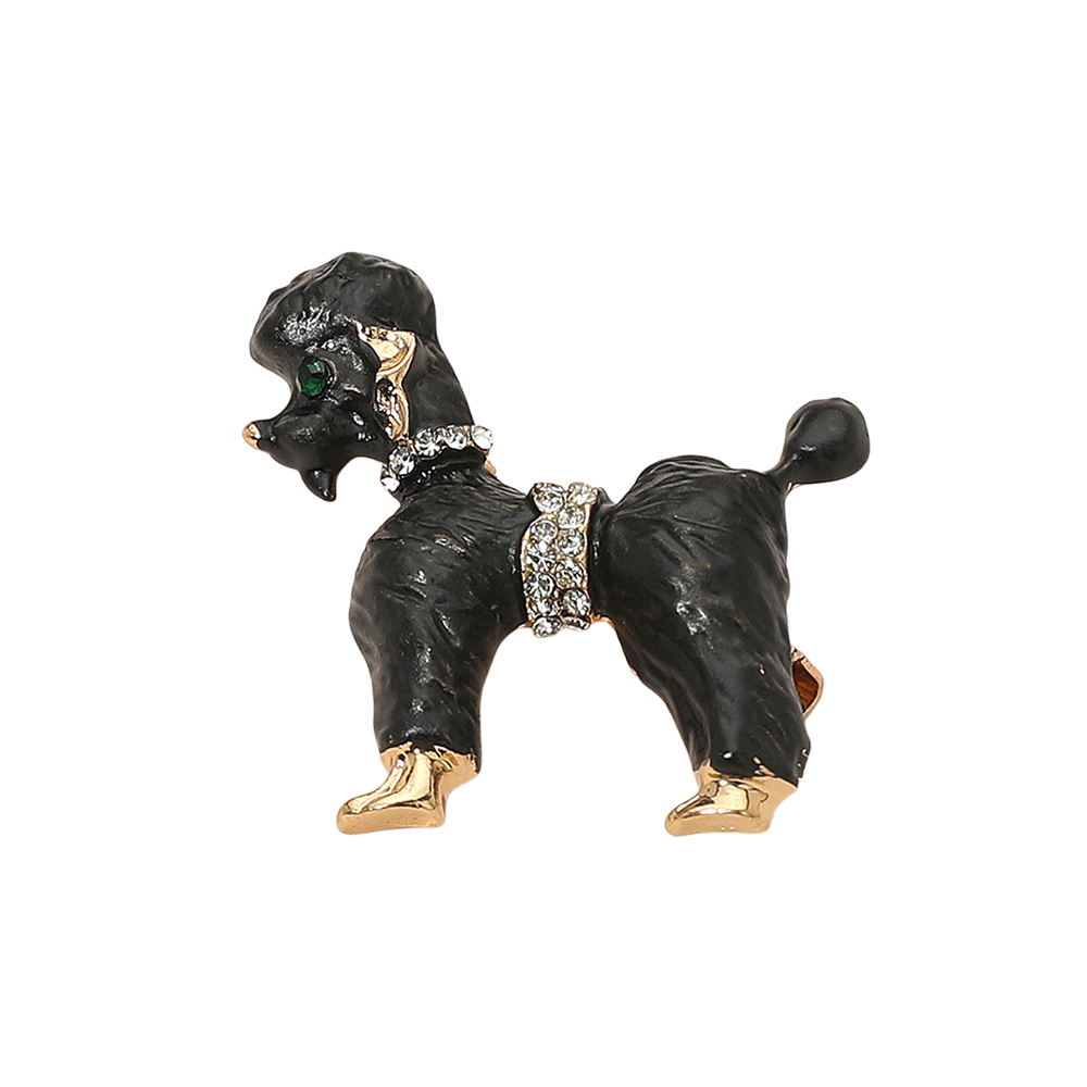 • Charming poodle brooch adorned with sparkling crystal collar and waist accents, detailed enamel finish, and gold-toned highlights. A delightful accessory for dog lovers, this brooch adds sophistication to jackets, scarves, or handbags while showcasing a love for pets and elegant fashion flair.