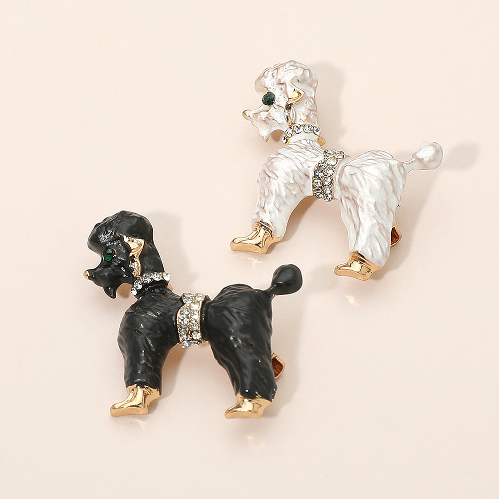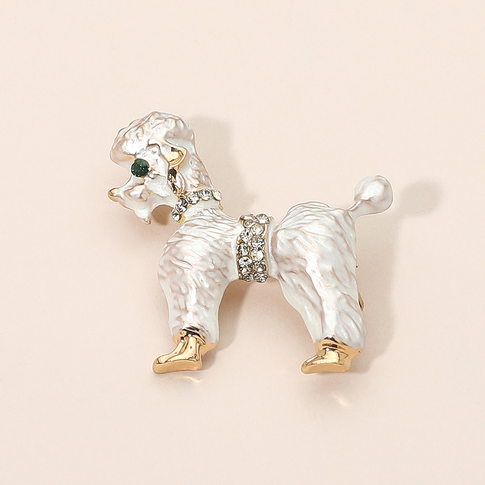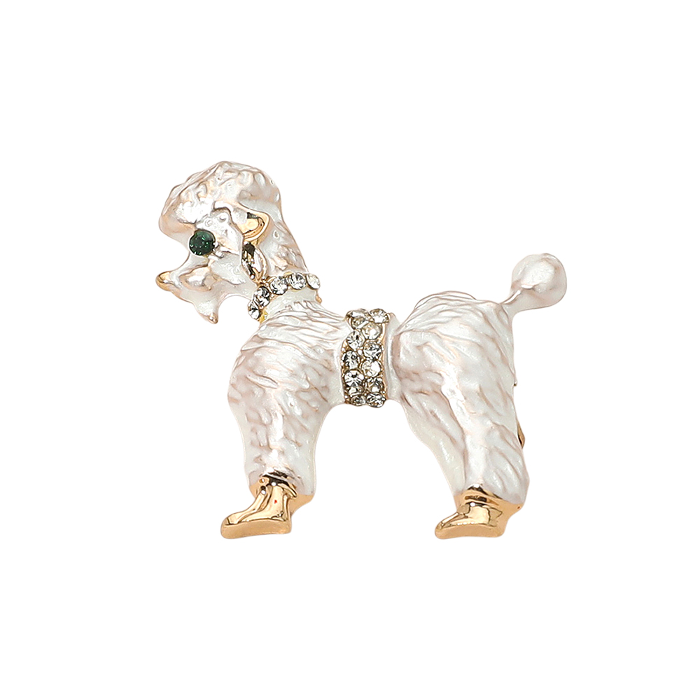 • Charming poodle brooch adorned with sparkling crystal collar and waist accents, detailed enamel finish, and gold-toned highlights. A delightful accessory for dog lovers, this brooch adds sophistication to jackets, scarves, or handbags while showcasing a love for pets and elegant fashion flair.