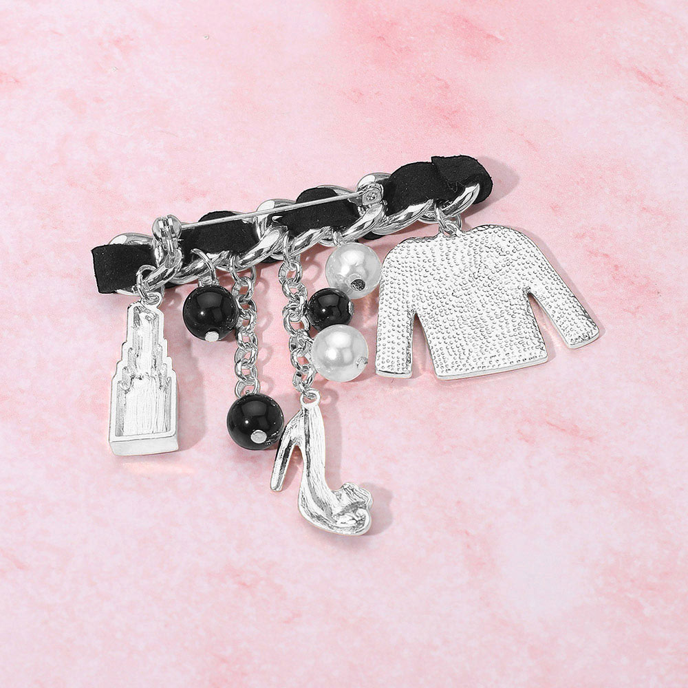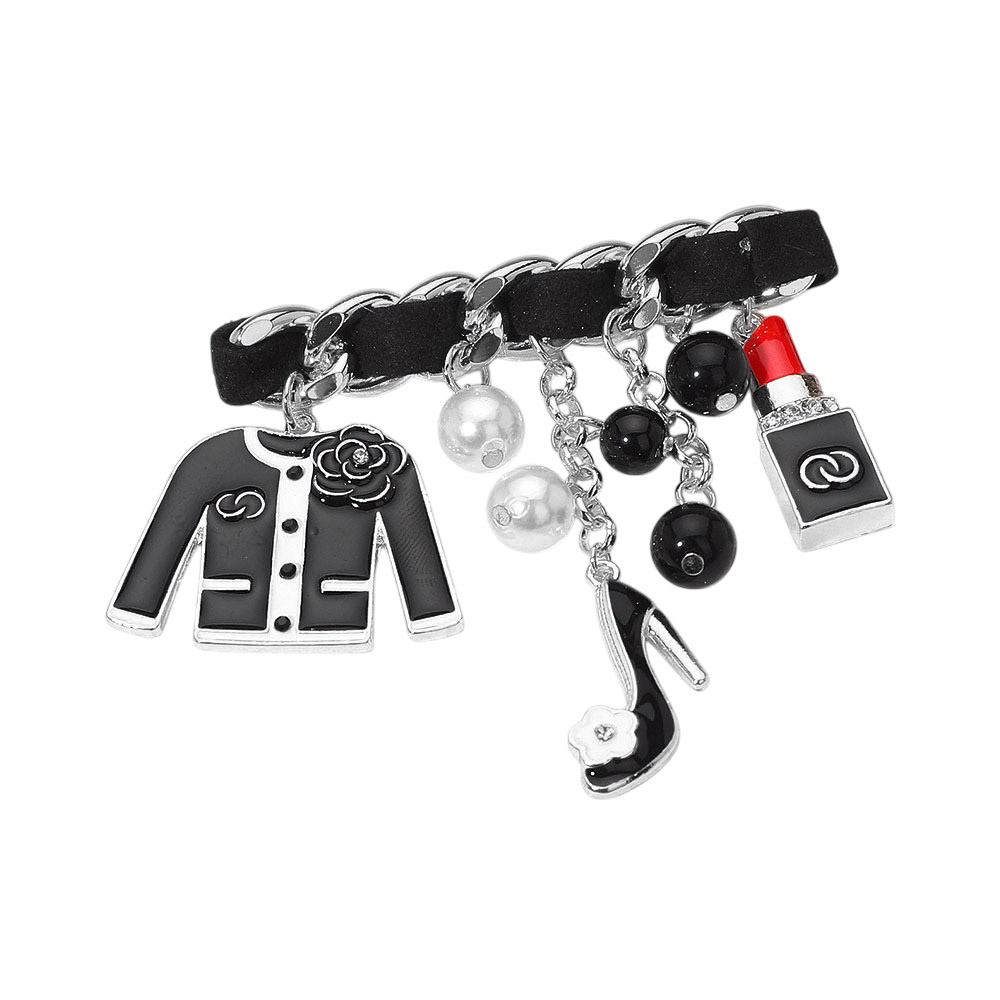 Details • Size : 2.75" X 2.75" • Pin Brooch • Chic fashion charm brooch featuring a mix of playful miniature pendants including a jacket, lipstick, and heel, accented with beaded details. A trendy statement accessory that adds personality and couture-inspired flair to jackets, bags, or scarves. • Lead and Nickel Compliant