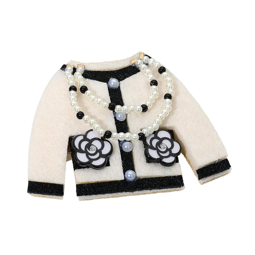 • Stylish dual-function brooch and hair clip shaped like a jacket, adorned with layered pearl chains and floral accents. Perfect for enhancing jackets, bags, or hairstyles, offering a touch of timeless fashion elegance with a versatile and sophisticated design.