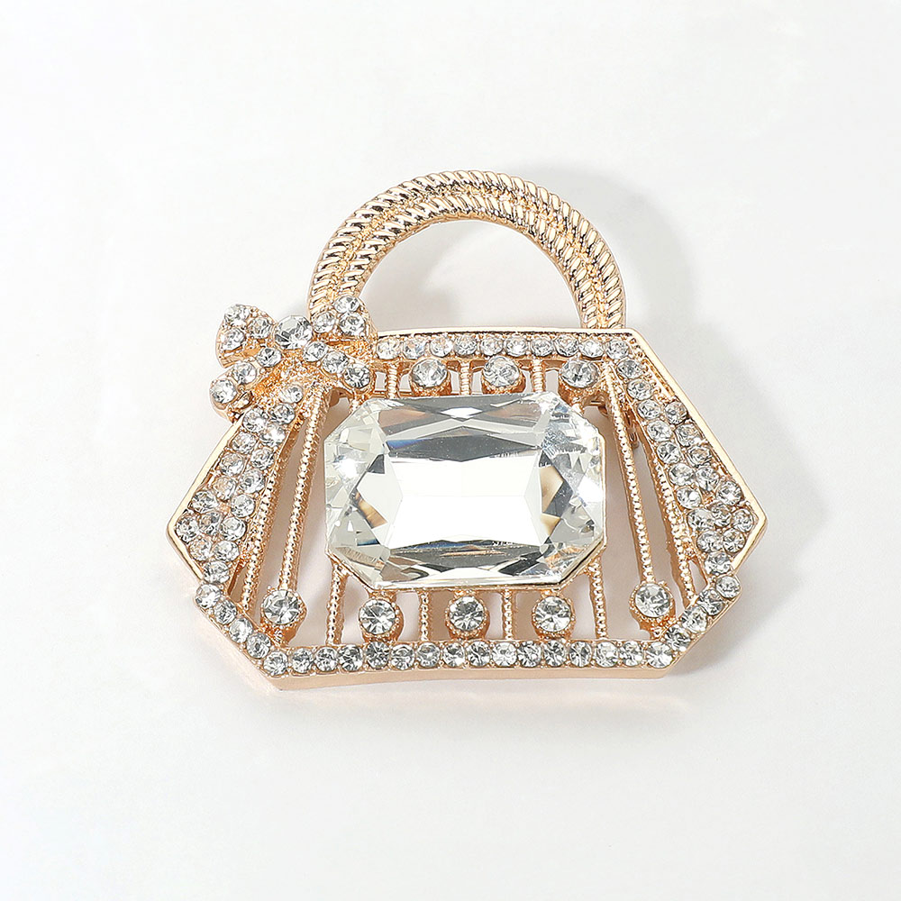 Details • Size : 2.1" X 2" • Pin Brooch • Elevate your style with this handbag-shaped brooch, featuring a large faceted crystal centerpiece, bow detail, and shimmering stones. A chic accessory for fashion lovers, it adds sparkle and charm to outfits for everyday or special occasions. • Lead and Nickel Compliant