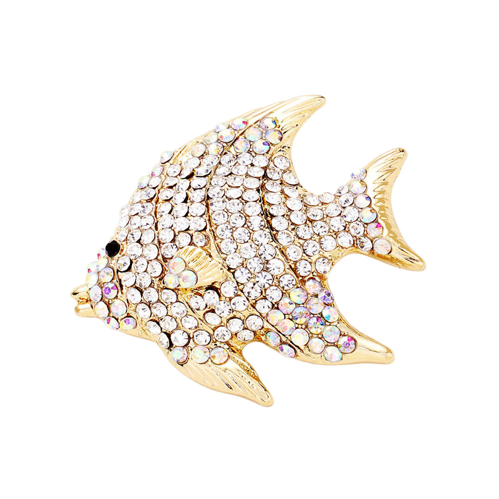 • Vibrant fish brooch adorned with sparkling rhinestones in a playful aquatic design. Perfect for adding a lively marine-themed accent to jackets, blouses, or bags with whimsical charm.