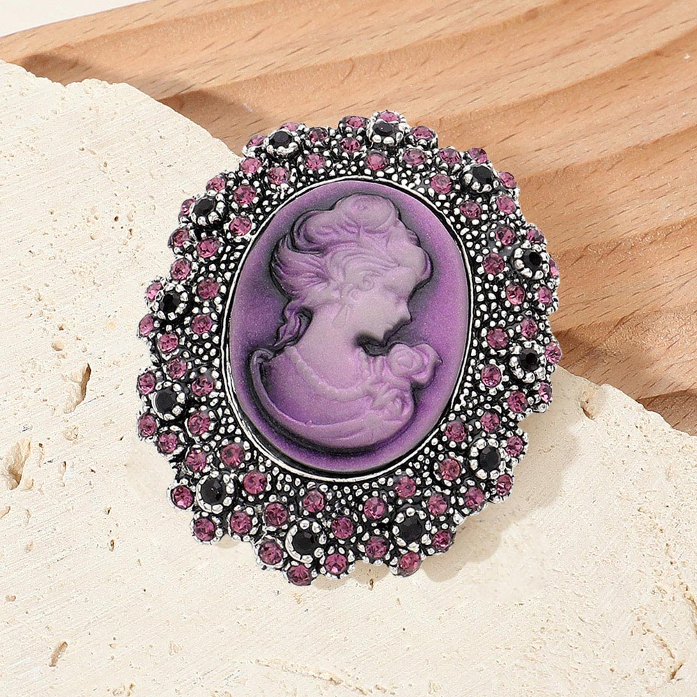 Details • Size : 1.6" X 1.8" • Pin Brooch • Timeless and elegant, this cameo brooch features a classic silhouette surrounded by vibrant decorative gems. A perfect statement piece for lovers of vintage fashion, it adds charm to lapels, scarves, or bags with its intricate and nostalgic design. • Lead and Nickel Compliant