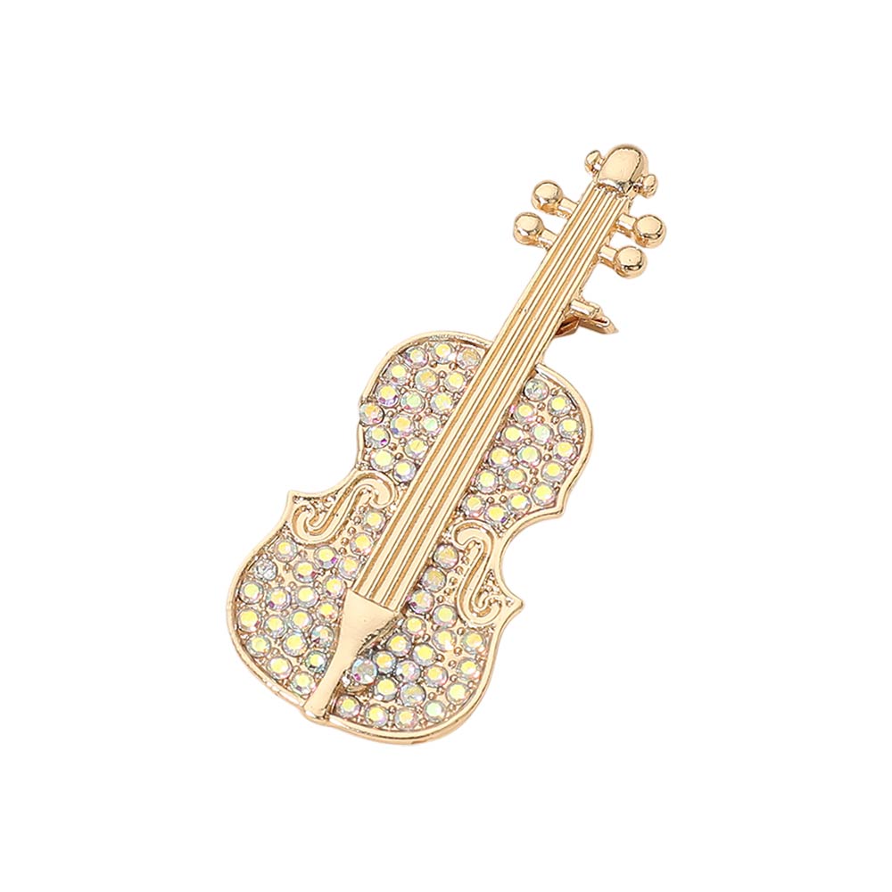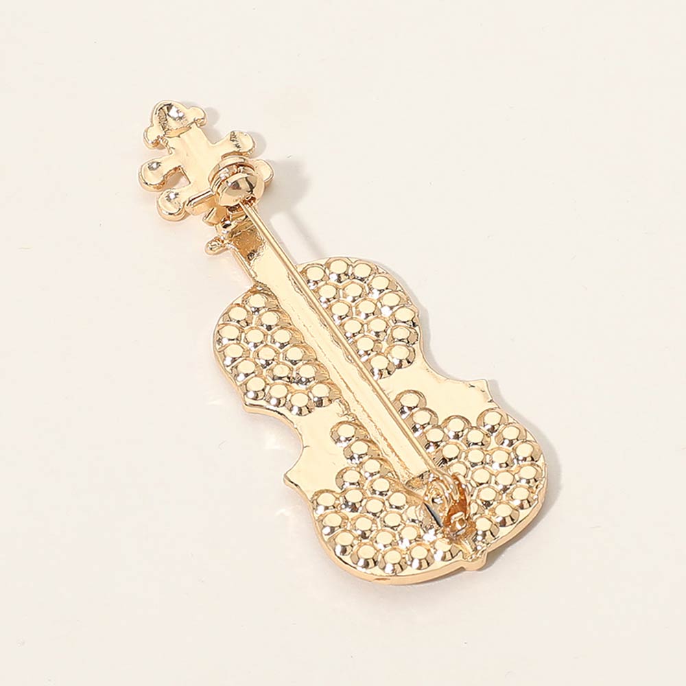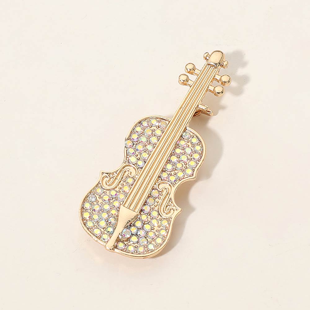Details • Size : 1" X 2.3" • Pin Brooch • Elegant violin-shaped brooch pin accented with sparkling crystal details for a refined, artistic look. Designed to add musical charm to jackets, dresses, scarves, or bags, this statement accessory is perfect for music lovers, performers, and gift collections seeking a timeless, expressive accent. • Lead and Nickel Compliant